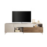 Meuble tv moderne 241 cm cashmere et chêne foncéCe meuble TV de salon de couleur cashmere et chêne foncé combine fonctionnalité et style contemporain. Avec ses 2 portes, dont 1 abattante vers le bas, et son tiroir, il offre des espaces de rangement pratiques. Les 2 niches ouvertes permettent d'exposer vos plus belles décorations. Mesurant 2m41, ce meuble télé peut accueillir une variété d'accessoires de salon. En option, vous pouvez ajouter 1 étagère murale et 2 cubes muraux pour plus de polyvalence. | ||