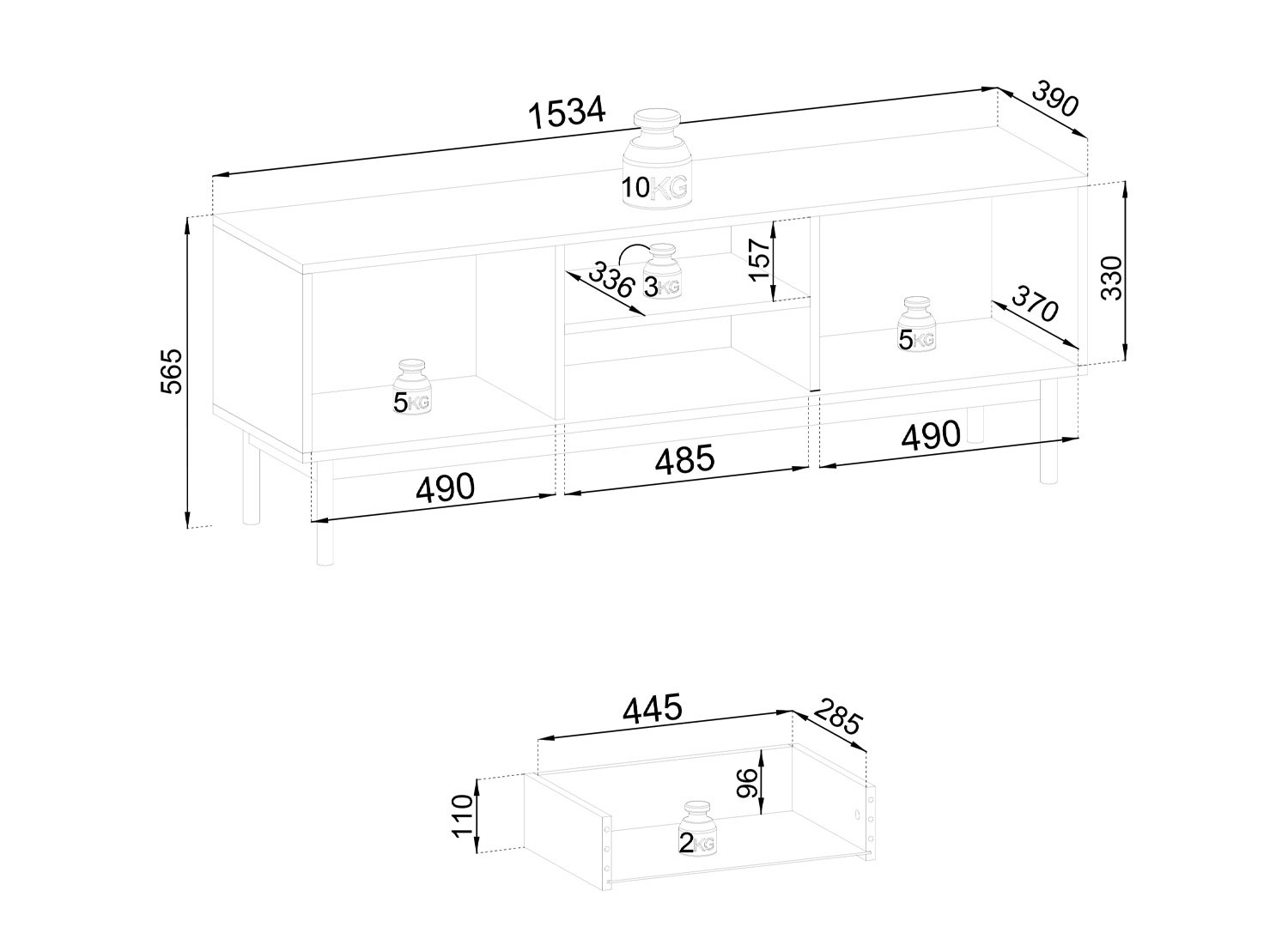 Dimensions meuble tv | L 153,4 x H 56,5 x P 39 cm |