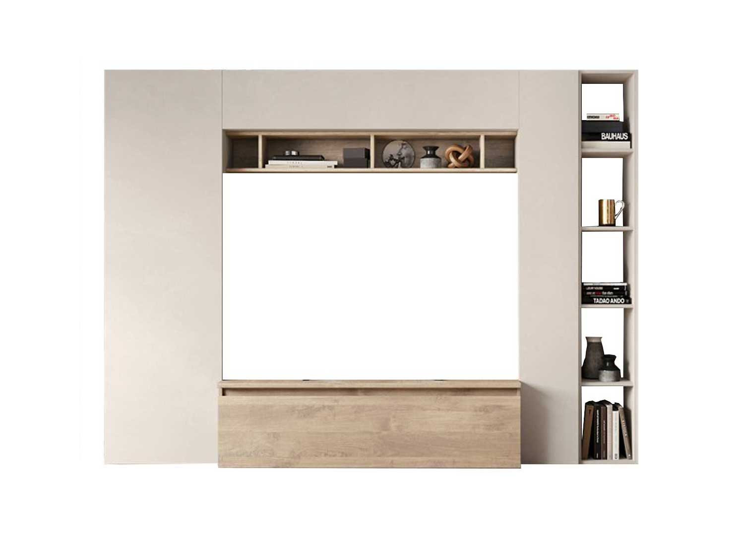 Meuble télé mural moderneAvec cet ensemble télé mural de couleur cachemire et chêne cadiz d'une longueur de 249 cm, vous trouverez le rangement nécessaire pour vos accessoires de salon. Parmi cet ensemble, un meuble étagère est parfait pour exposer vos objets de décoration préférés. Ce meuble est rehaussé par un meuble de 1 porte abattante vers le haut ou le bas, idéal pour ranger vos DVD ou livres. Deux colonnes d'une porte chacune vous offrent un espace de rangement discret pour dissimuler des objets que vous préférez garder hors de vue. Cet ensemble TV est également doté d'un meuble à compartiments qui peut servir pour exposer vos objets de collection. Le banc TV est conçu pour accueillir votre téléviseur tout en offrant du rangement pour les télécommandes ou manettes de jeu. | ||