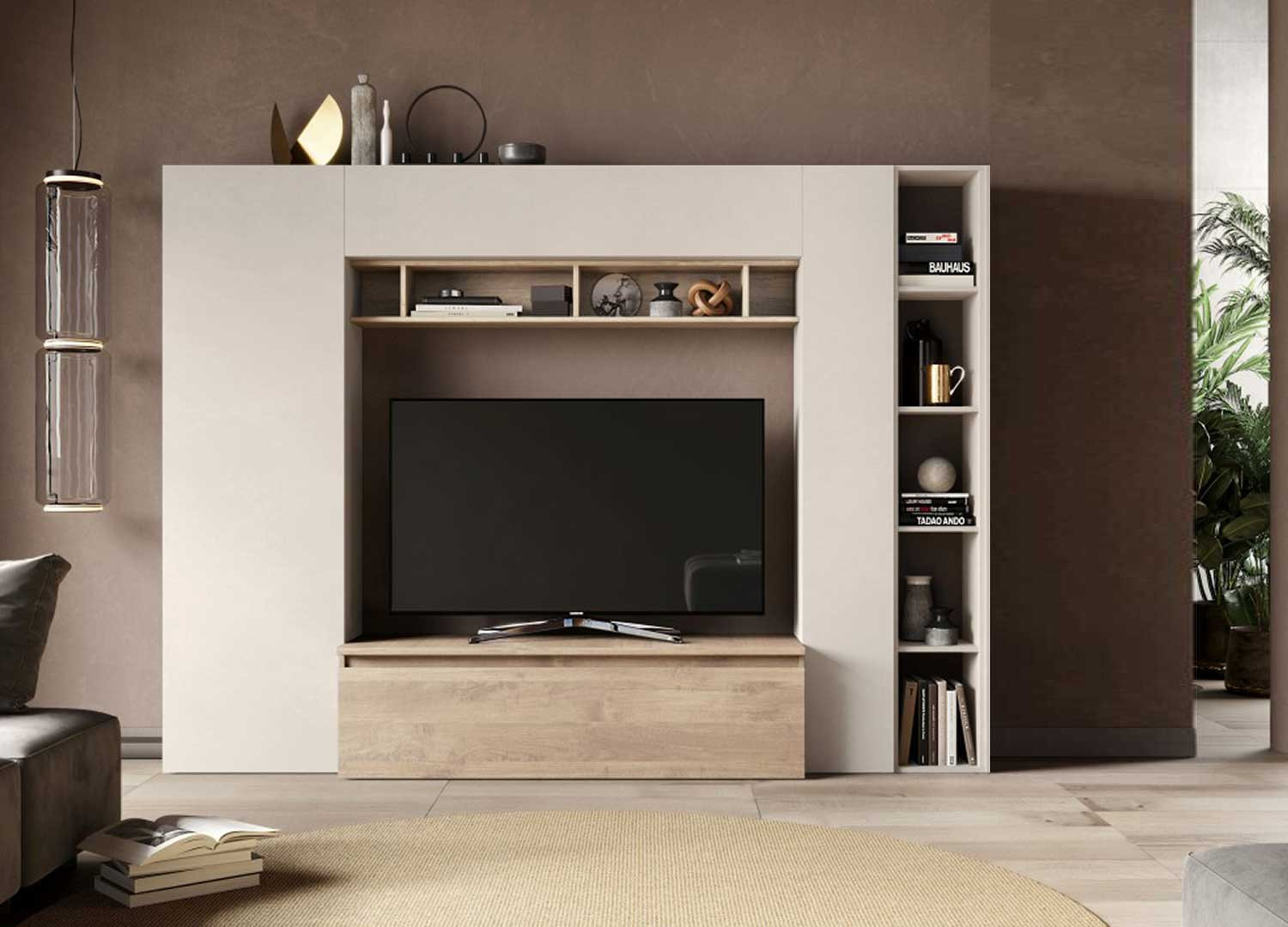 Cet élégant meuble télé mural de 249 cm de longueur associe des couleurs tendances cachemire et chêne cadiz. Composé de six modules avec portes et compartiments ouverts, cet ensemble TV offre un équilibre parfait entre rangement pratique et design contemporain. Idéal pour accueillir un écran plat et exposer des objets décoratifs, il apportera à votre salon une touche de modernité tout en optimisant l’espace.