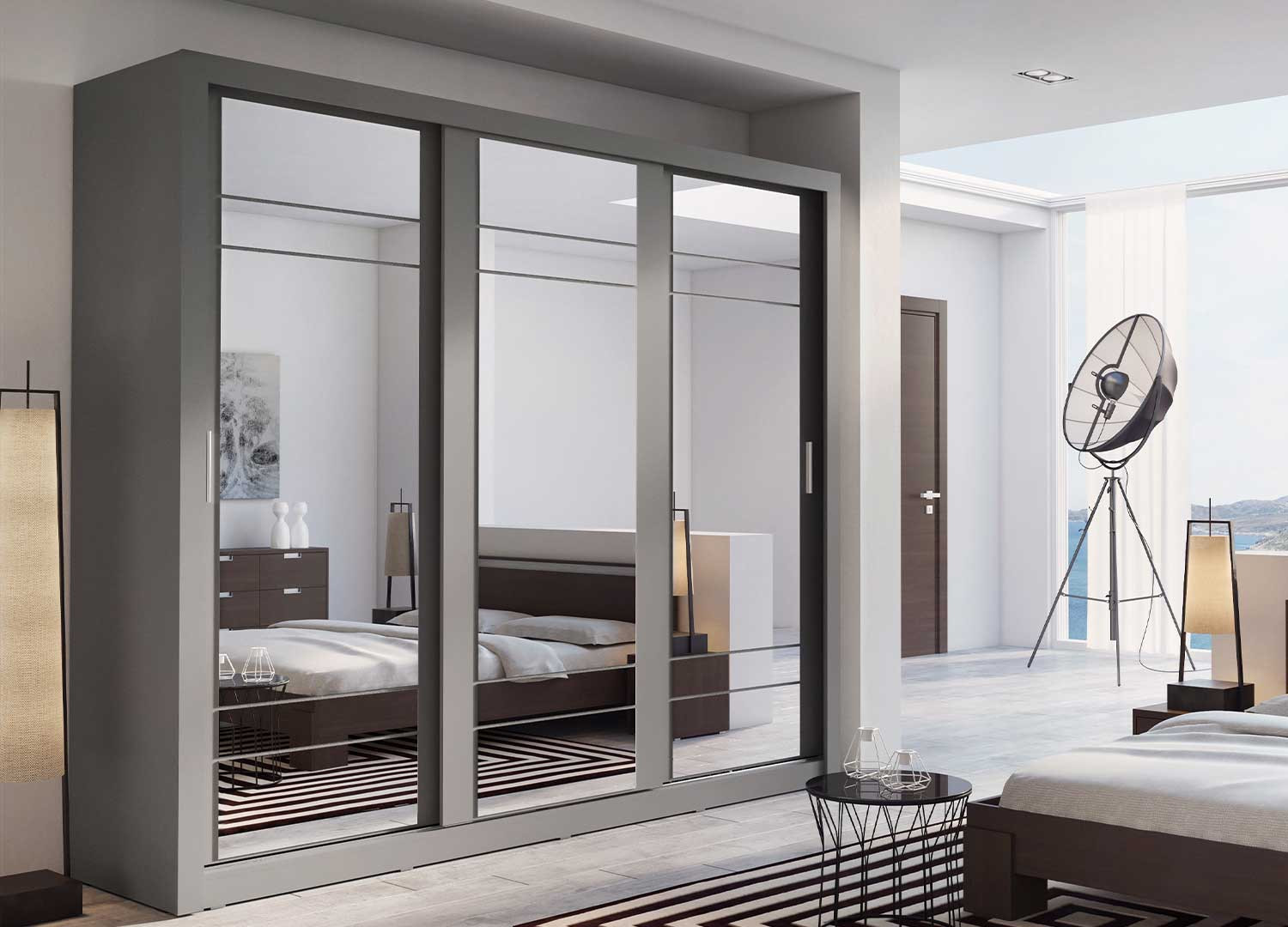 Cette magnifique armoire grise de 3 portes coulissantes dispose de grands miroirs sur chaque façade de porte. Les 3 portes révèlent un intérieur spacieux et élégant. À l'intérieur, l'armoire est équipée de deux penderies, l'une sur chaque côté, pour suspendre les vêtements. Cette grande armoire grise dispose également de 7 compartiments pour le linge plié. Cette armoire de chambre en bois gris offre un design intemporel qui s'adapte à n'importe quelle décoration d'intérieur. Son look impeccable et sa fonctionnalité font de cette armoire une pièce maîtresse moderne pour toute maison.