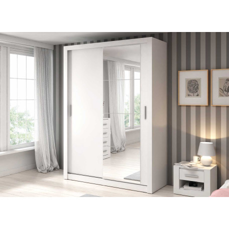 Cette armoire de chambre blanche de 150 cm est un meuble design et fonctionnel doté d'une façade miroir et d'un aménagement intérieur bien pensé. Elle est composée d'une penderie et de compartiments de rangement pour organiser tous vos vêtements et accessoires. Sa fabrication robuste en panneaux de particules associe qualité et esthétique et offre une longue durée de vie à votre armoire. Sa longueur de 150 cm vous permet d'optimiser l'espace et d'accéder facilement à vos vêtements. Cette armoire est une excellente solution de rangement pour une chambre à coucher.