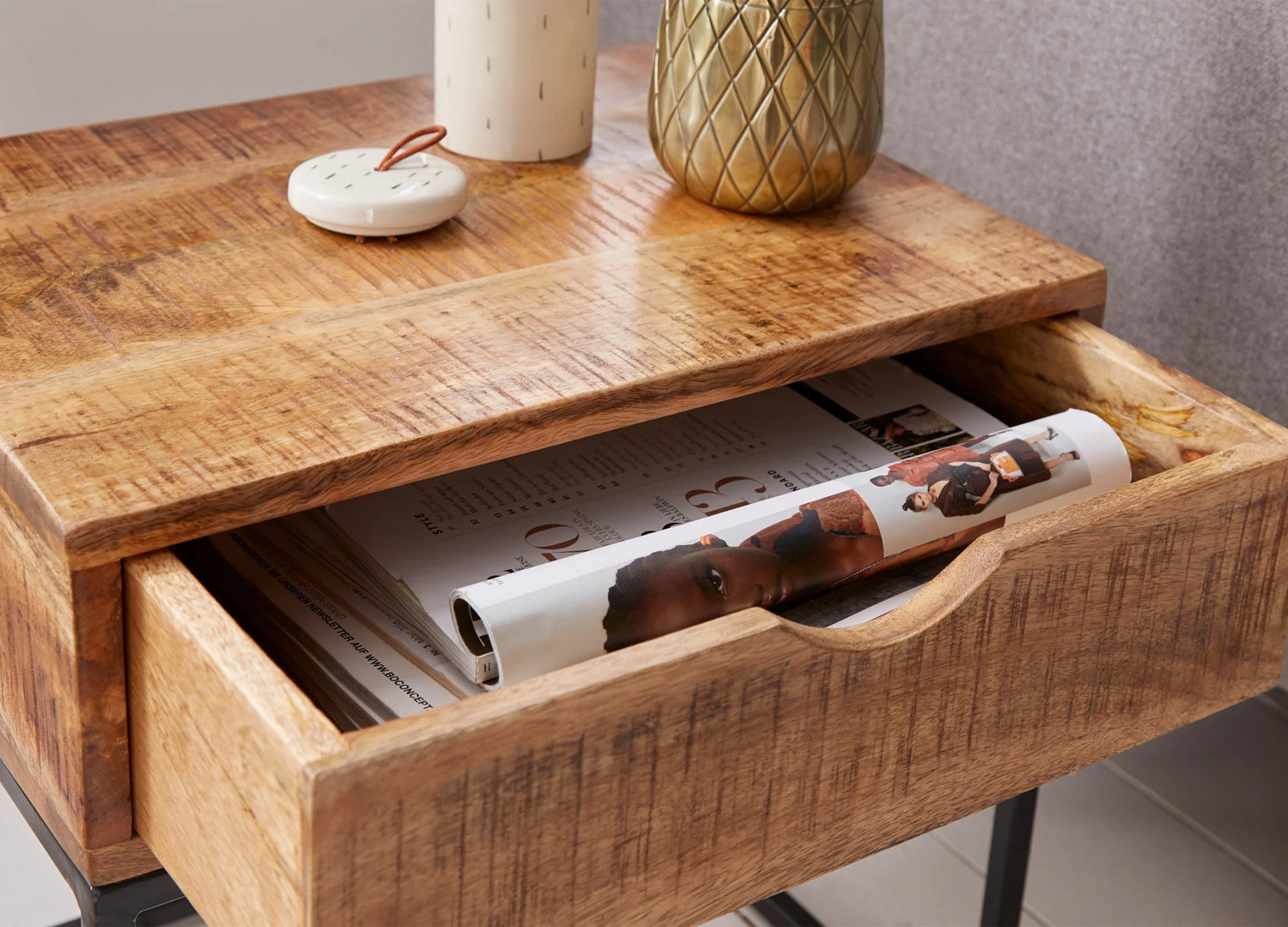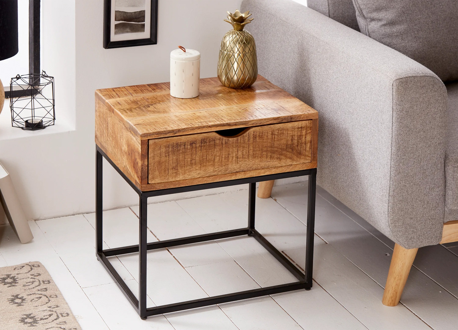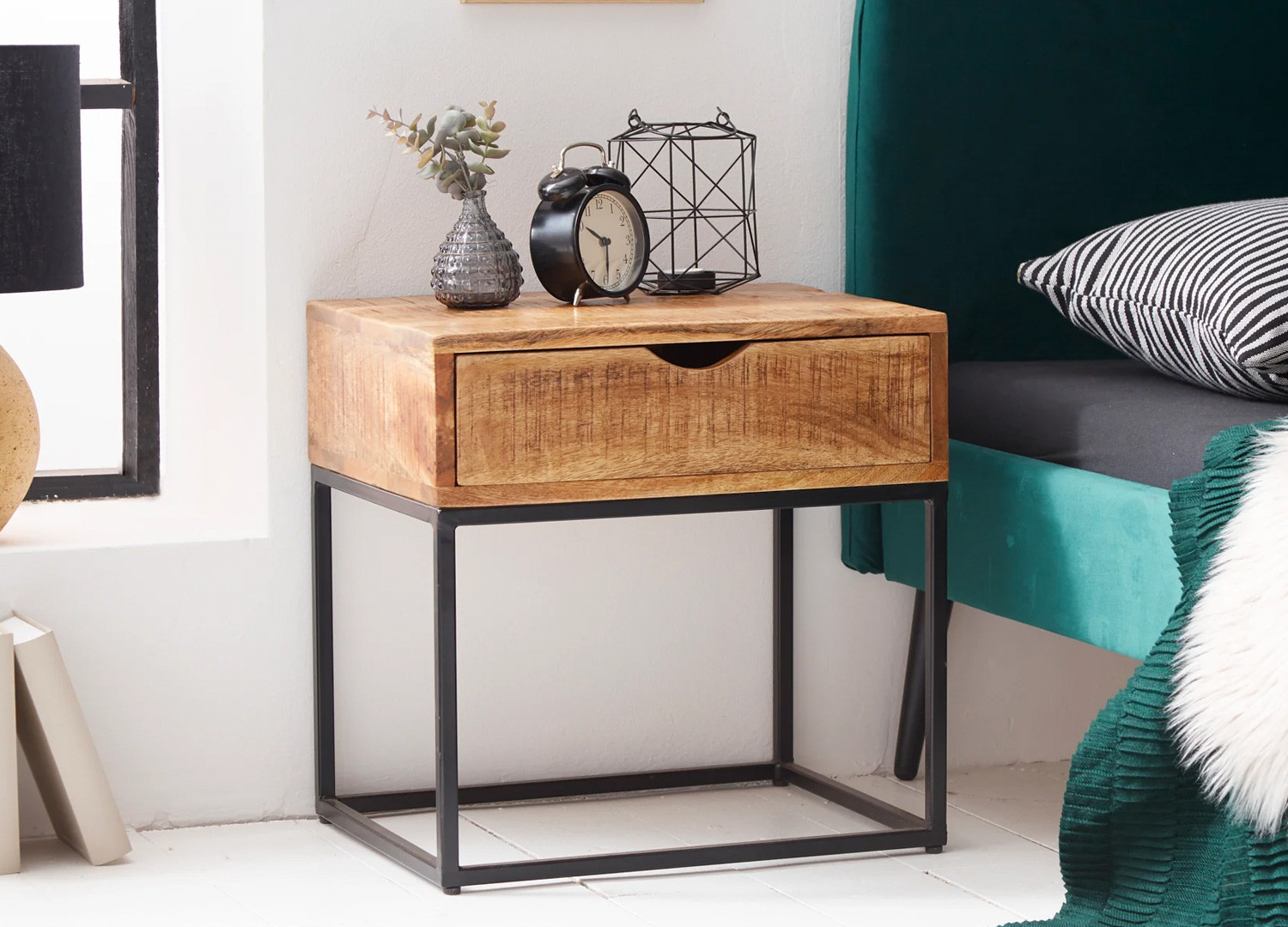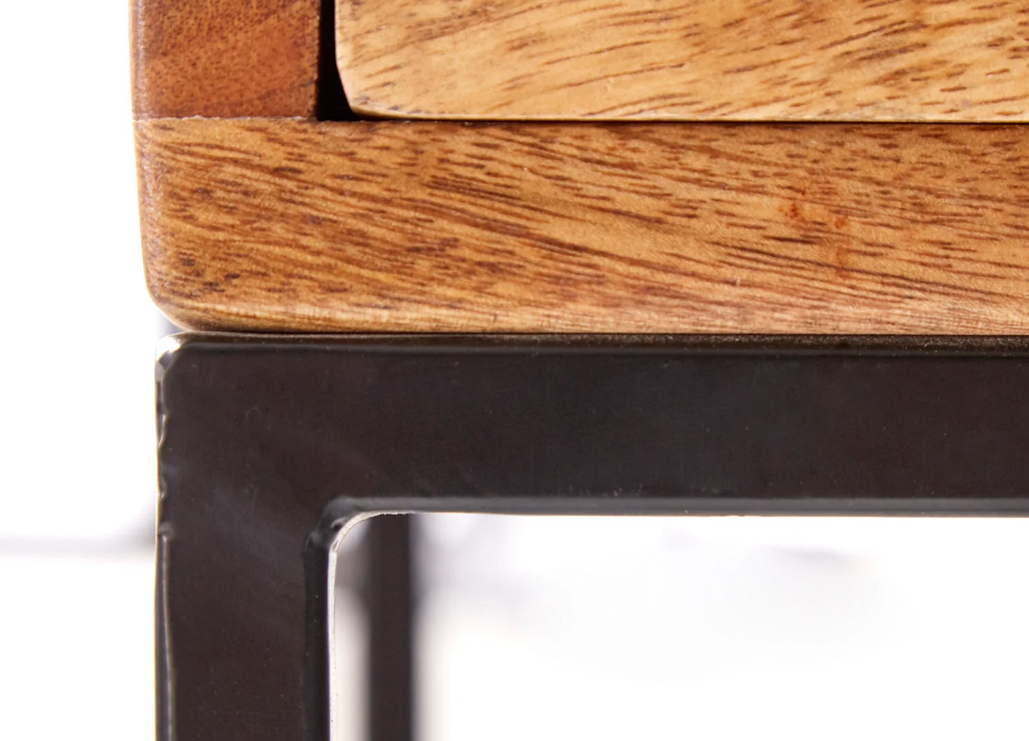 Avec son design compact et affirmé, la table de chevet Nest en manguier et métal noir apporte un esprit chic à toute chambre. Son tiroir offre un rangement pratique pour vos essentiels, tandis que son plateau supérieur accueille lampe, livre ou objet déco avec style. Petite mais pleine de caractère, elle incarne parfaitement l’esprit industriel contemporain.