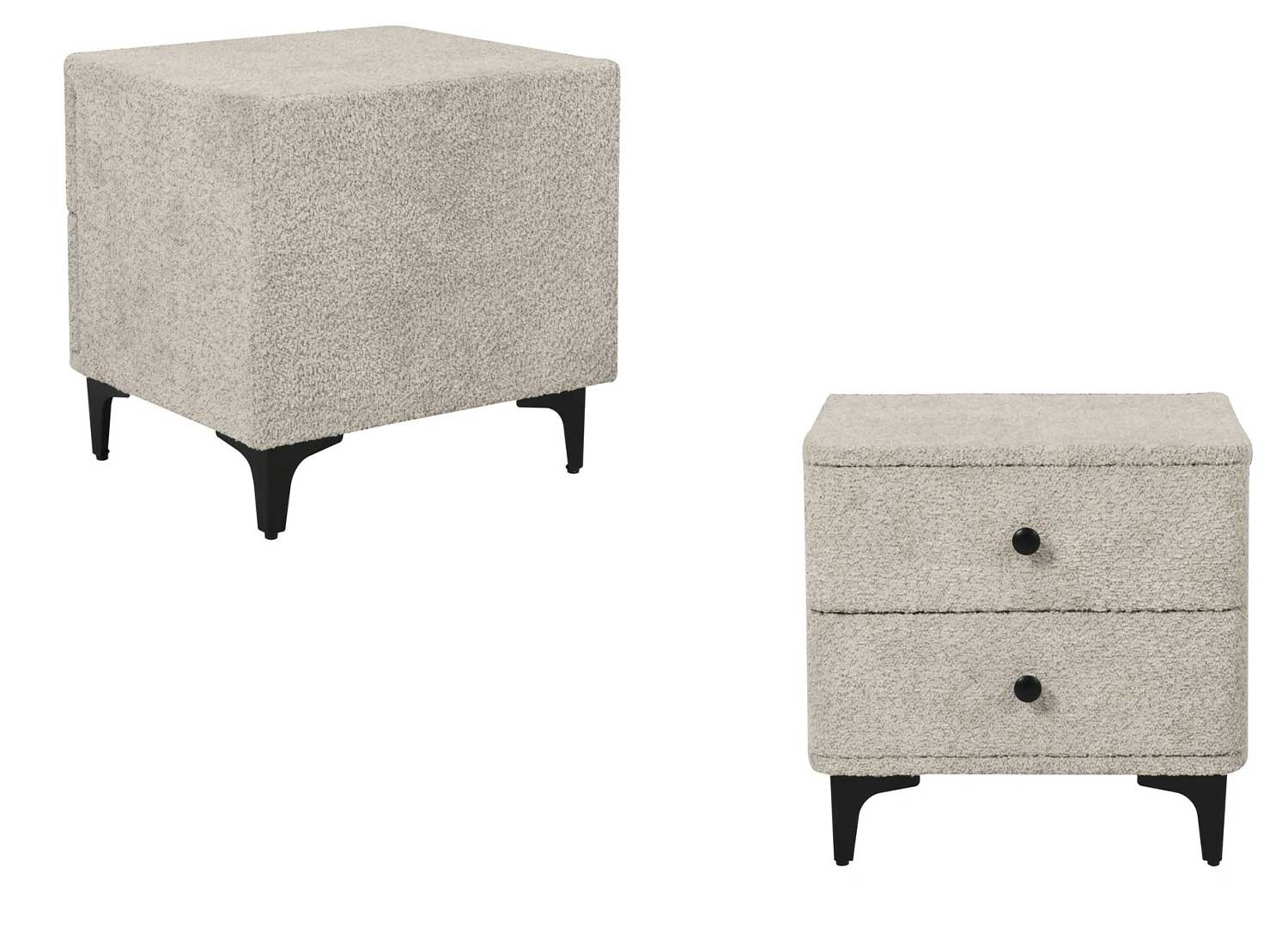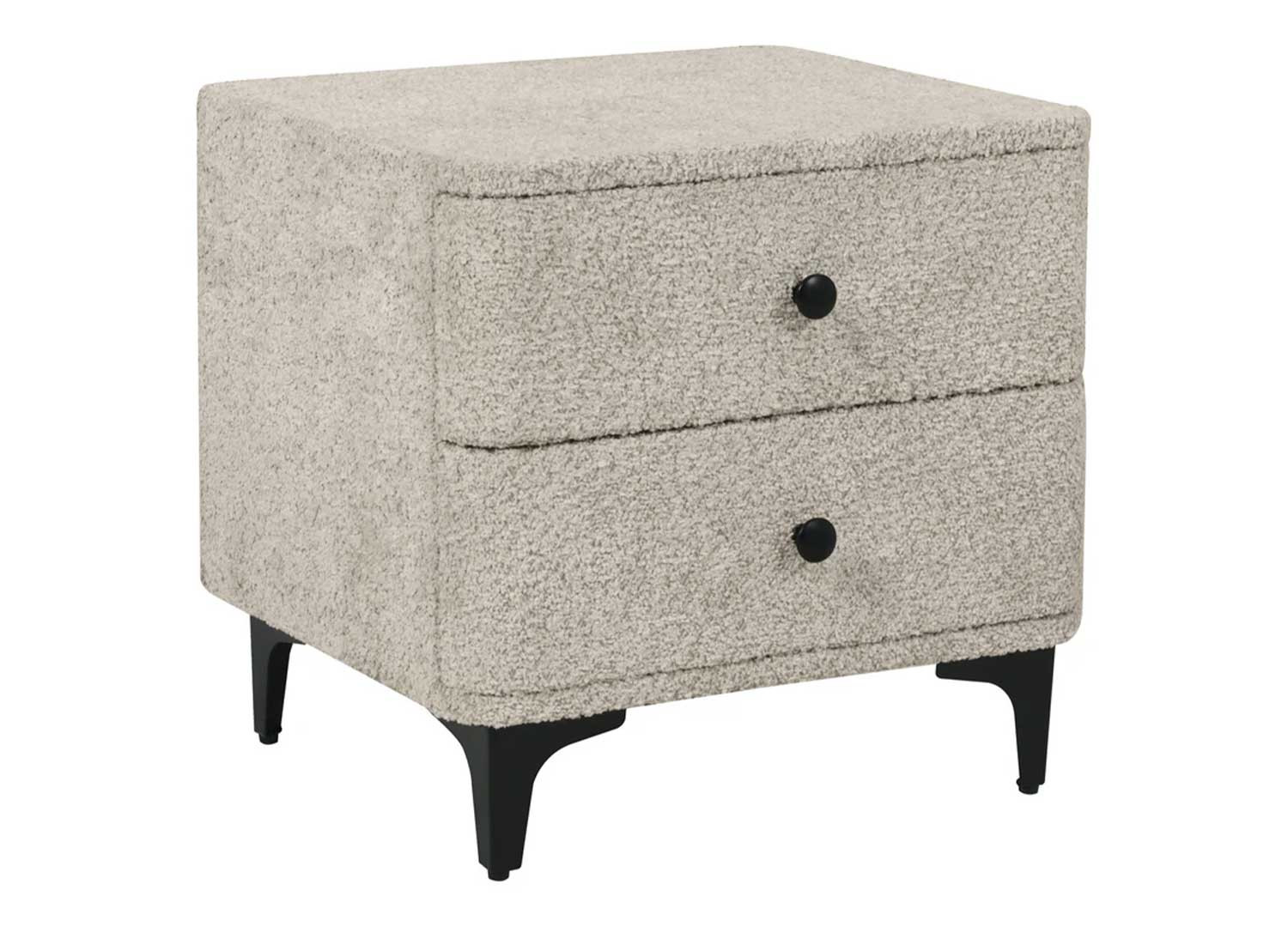 Le chevet Natalia est recouvert d’un tissu bouclé grège qui lui apporte une allure cocooning. Doté de deux tiroirs, il propose du rangement pour les objets que l'on souhaite avoir à portée de main. Les poignées en métal noir apportent une petite note graphique. Le chevet repose sur des pieds métallique noir d'une hauteur de 9 cm.