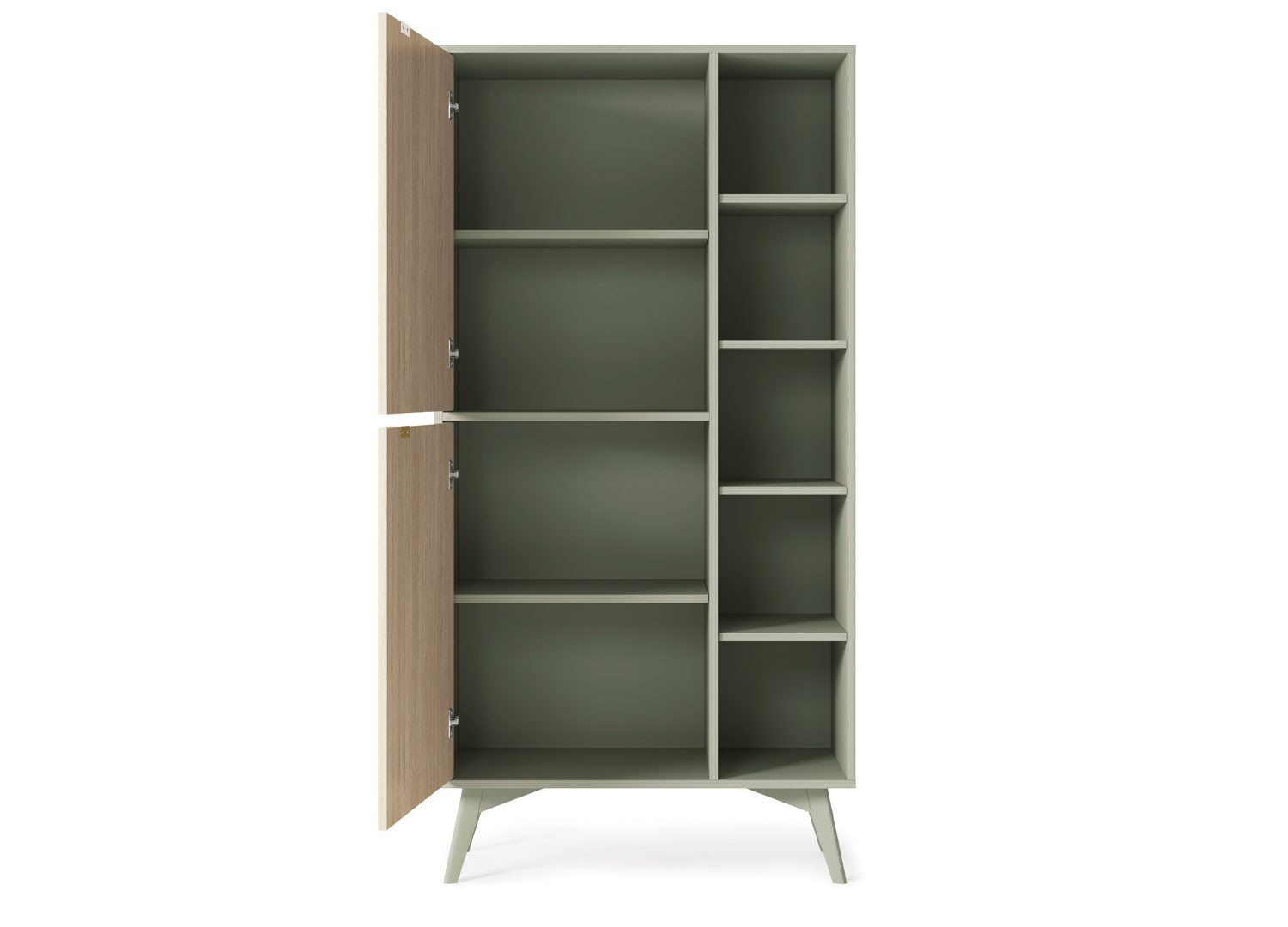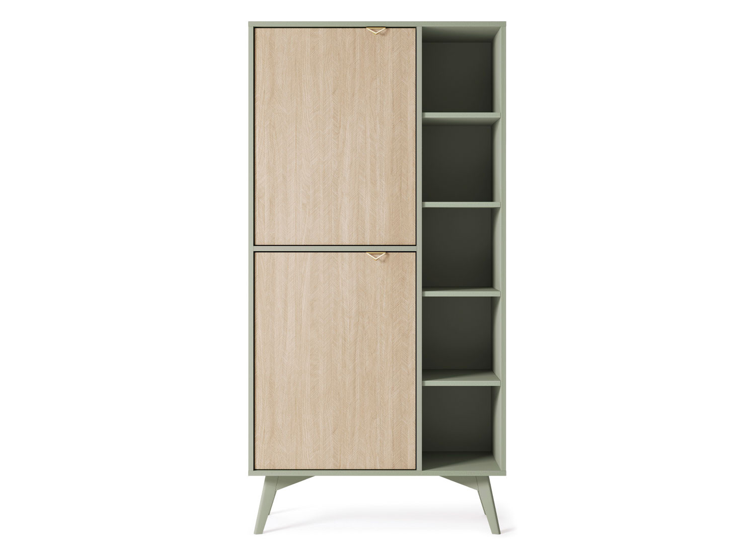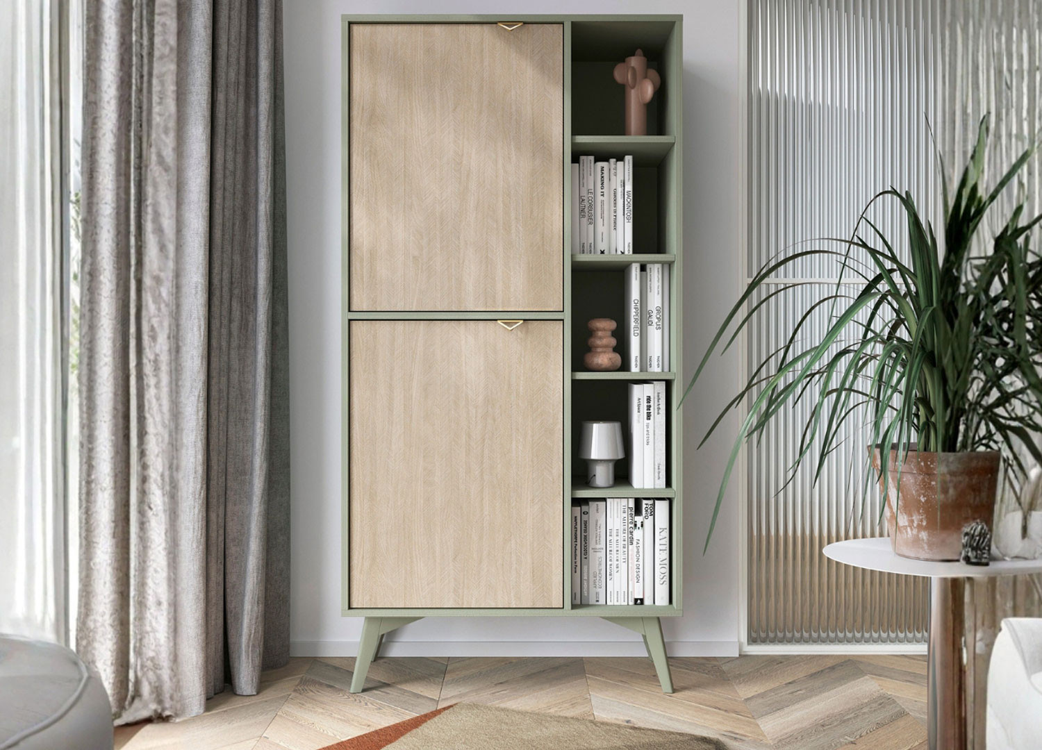 La bibliothèque Forest de 160 cm de hauteur séduit par ses couleurs : le bois clair et le vert. Grâce à ses lignes épurées, elle s’intègre aisément dans des décors scandinaves ou bohèmes. Avec ses espaces ouverts, elle permet de jouer sur l’esthétique : alterner livres, objets déco et touches végétales pour un rendu vivant et personnalisé. Les deux portes permettent de dissimuler les éléments plus utilitaires.