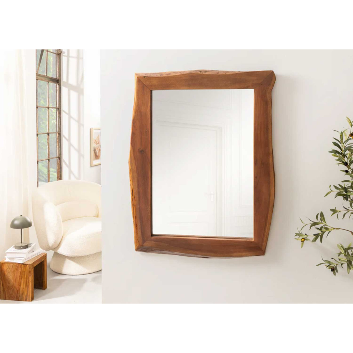 Ajoutez un élément fort et naturel à votre décoration avec le miroir rectangulaire Laura de 102 cm, encadré d’un bois d'acacia massif teinté brun et travaillé avec des bordures naturelles.