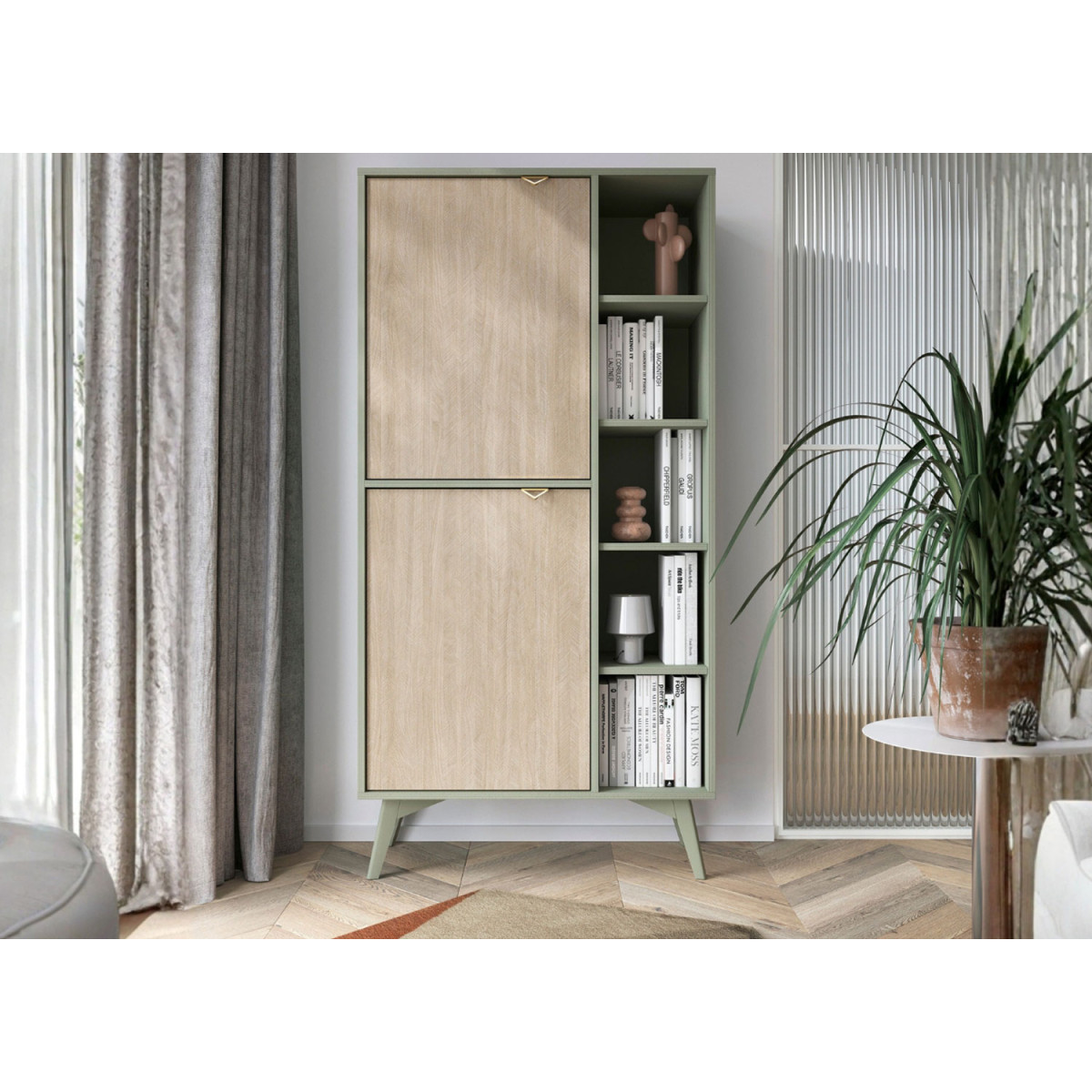La bibliothèque Forest de 160 cm de hauteur séduit par ses couleurs : le bois clair et le vert. Grâce à ses lignes épurées, elle s’intègre aisément dans des décors scandinaves ou bohèmes. Avec ses