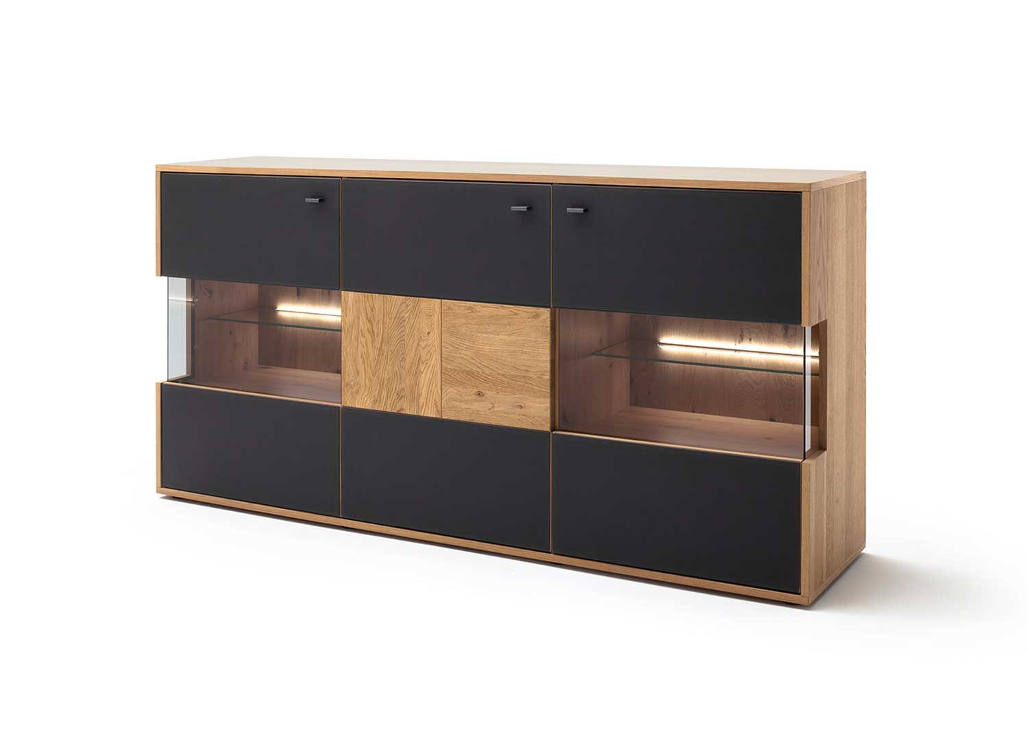 Ce buffet de 184 cm en placage chêne bianco et verre anthracite est doté de poignées en métal et de trois portes à fermeture amortie. Il offre de généreux espaces de rangement derrière ses portes vitrées et sa porte pleine, avec des étagères en bois et en verre pour organiser vaisselle ou objets décoratifs.