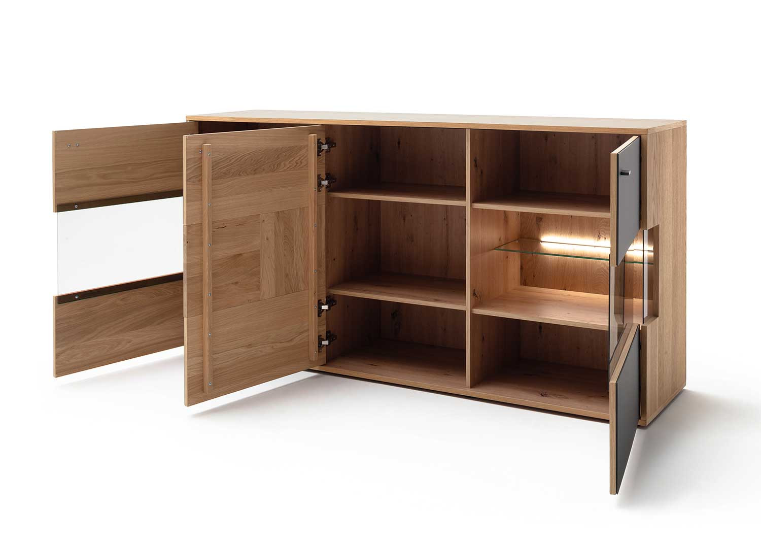 | Matériau | Façade : chêne bianco massif à lamelles continues et verre anthracite satiné / Structure : placage chêne bianco / Dos : imitation chêne bianco / Verre : façade et vitrage latéral parsol gris et étagères verre transparent |