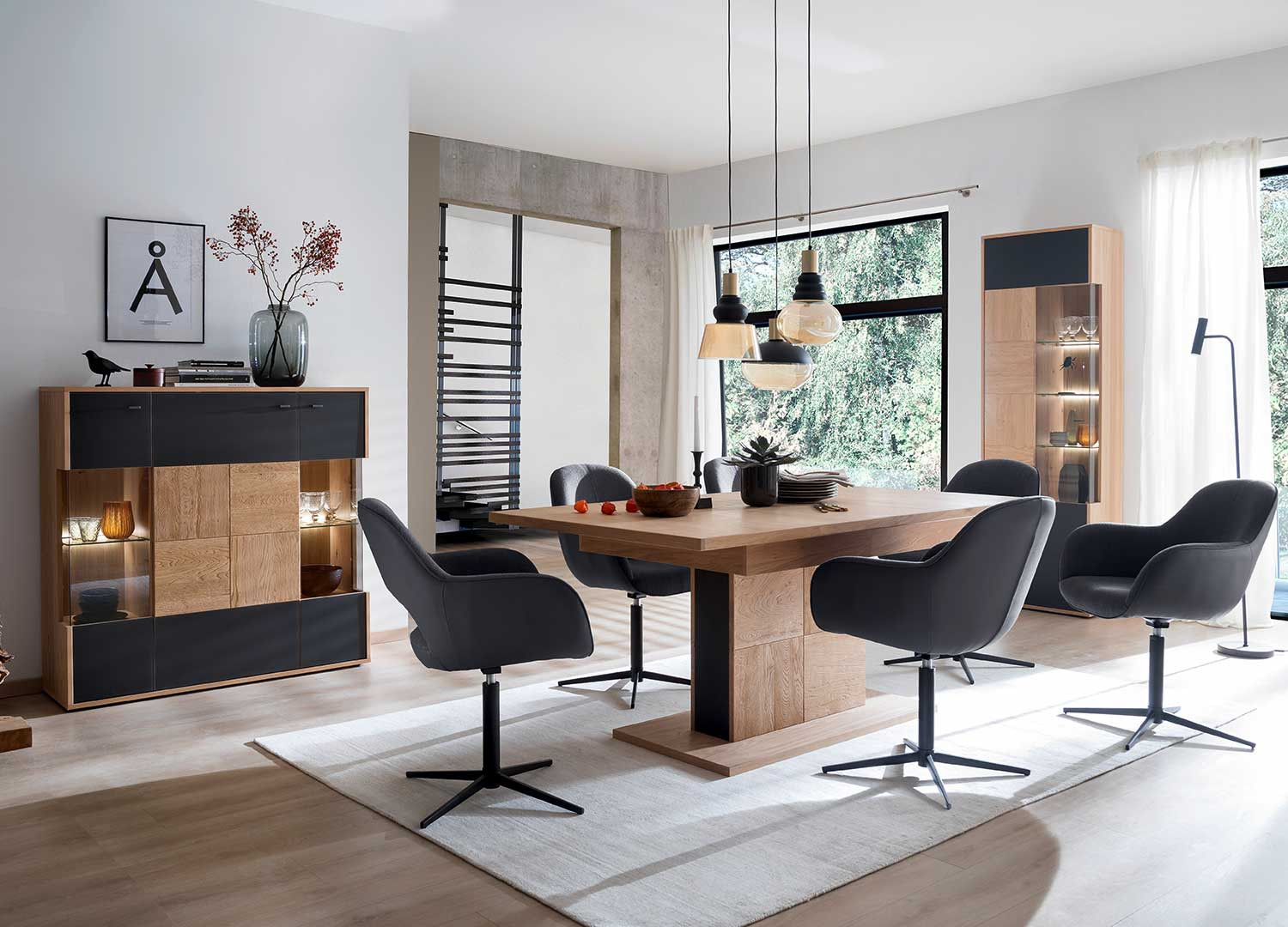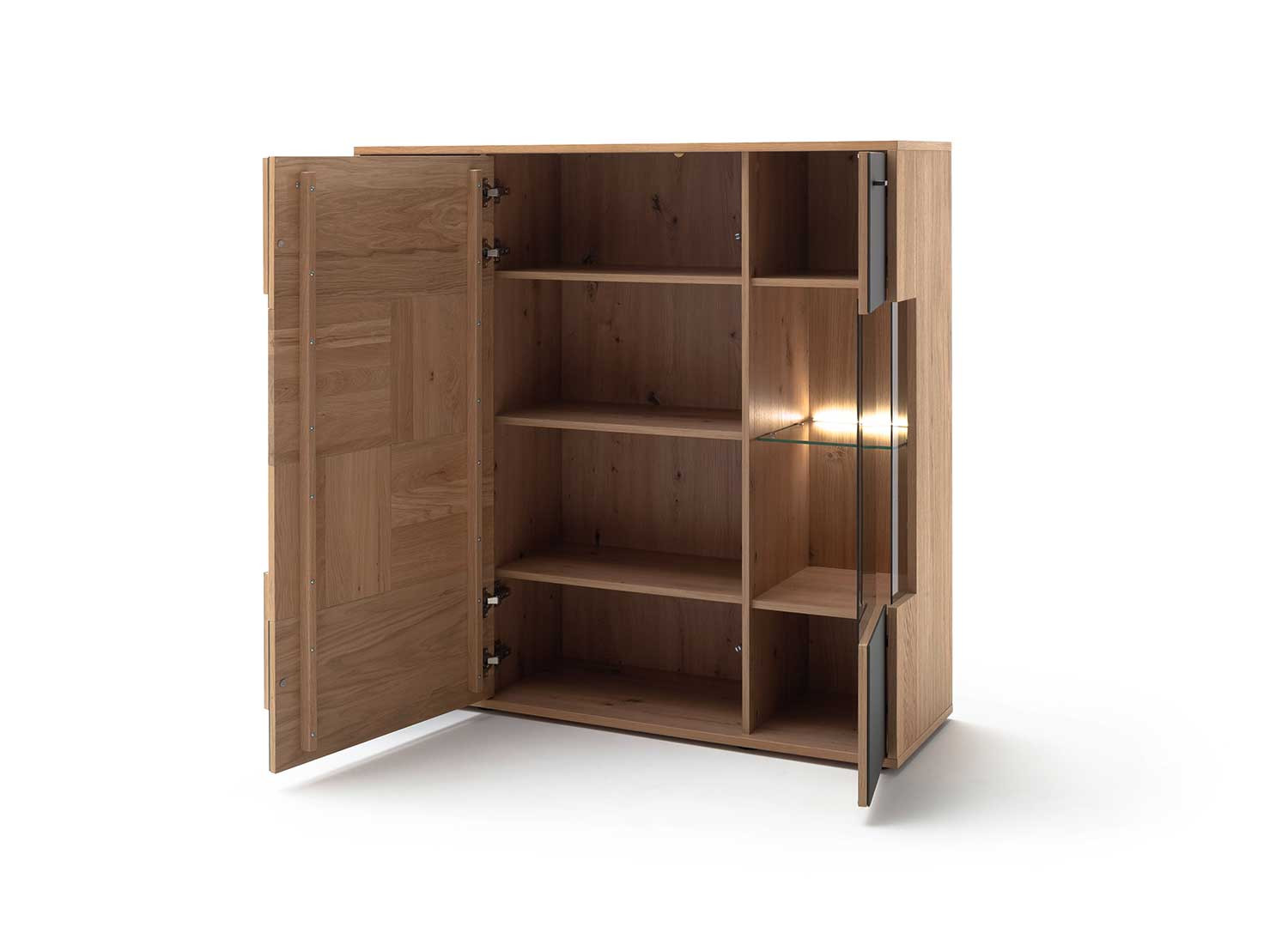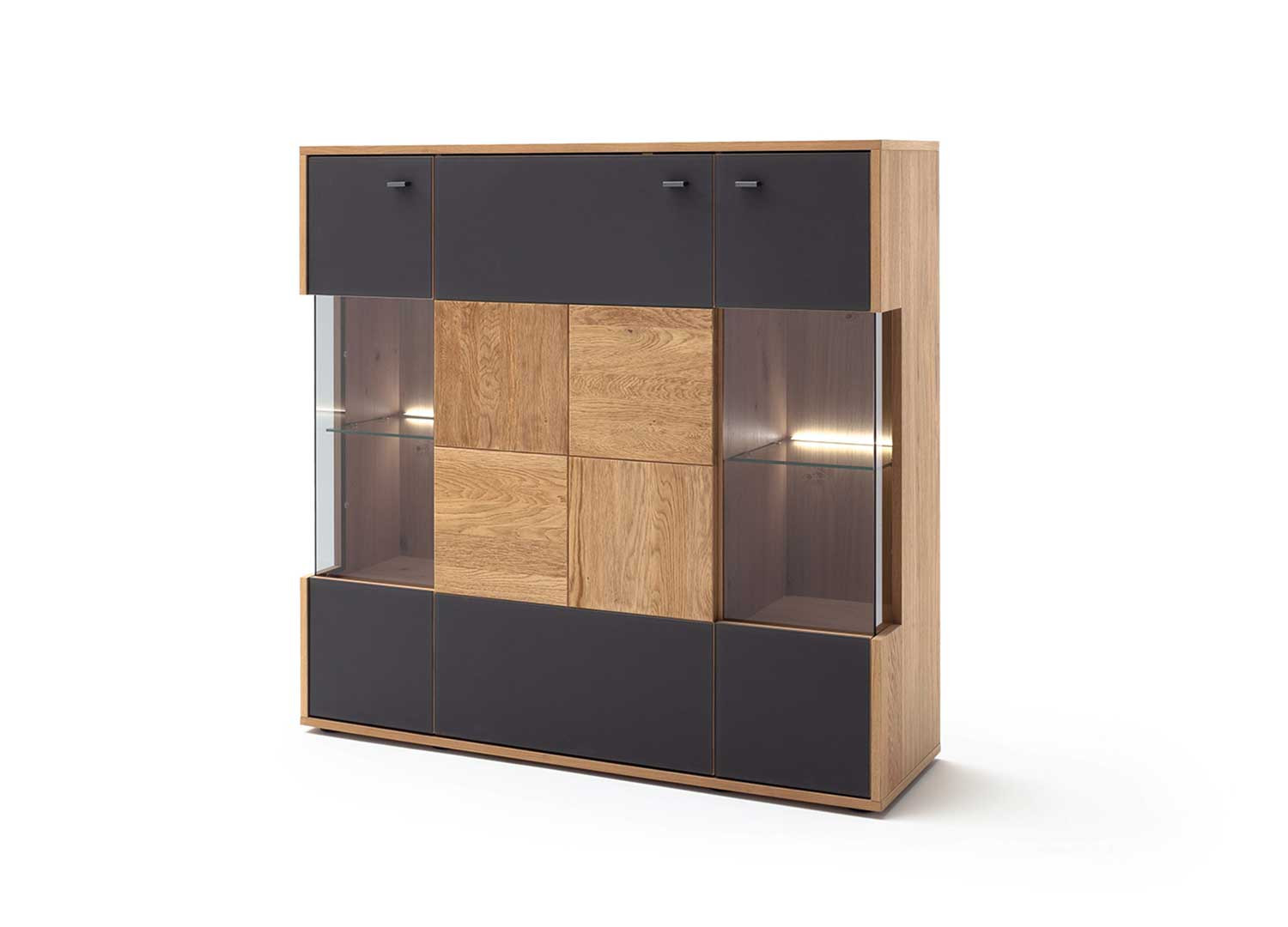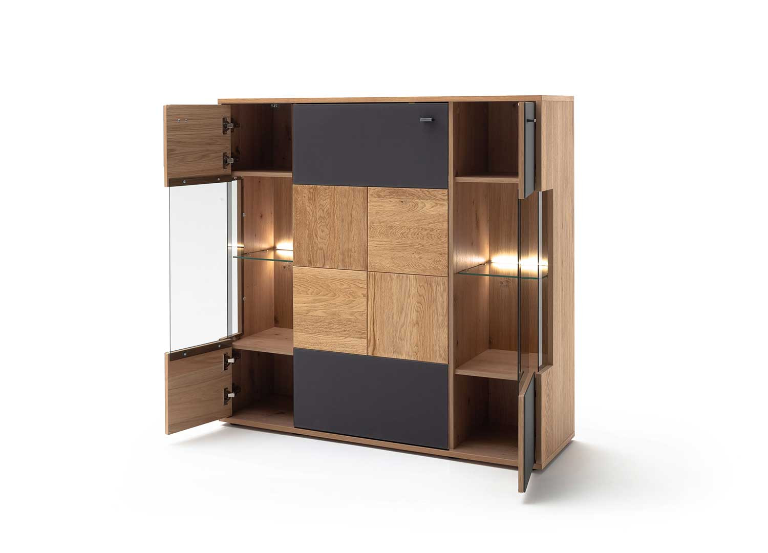 ✓ Donnez du caractère à votre salle à manger avec ce buffet haut en placage chêne bianco et verre anthracite, une pièce élégante aux finitions soignées avec des espaces de rangement généreux.
