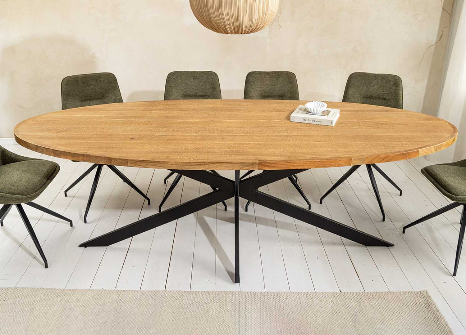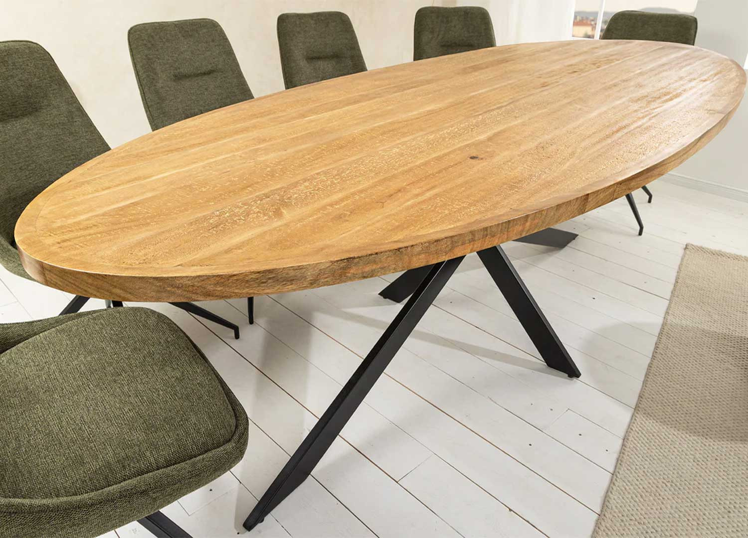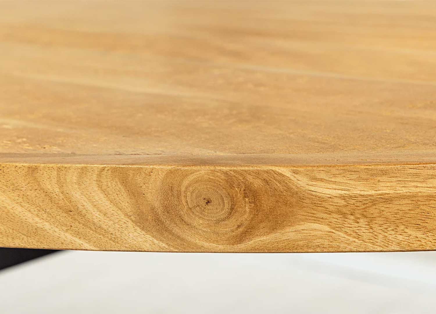 Conçue en bois de manguier massif à la teinte naturelle marron clair, la table à manger Tilio séduit par son grain authentique, ponctué de légères variations de teintes qui rendent chaque pièce unique. Son plateau ovale de 240 cm repose sur un piètement en métal noir araignée. Cette alliance du bois naturel et du métal incarne parfaitement le style industriel chic. Cette table de salle à manger est idéale pour accueillir confortablement 8 à 10 convives.