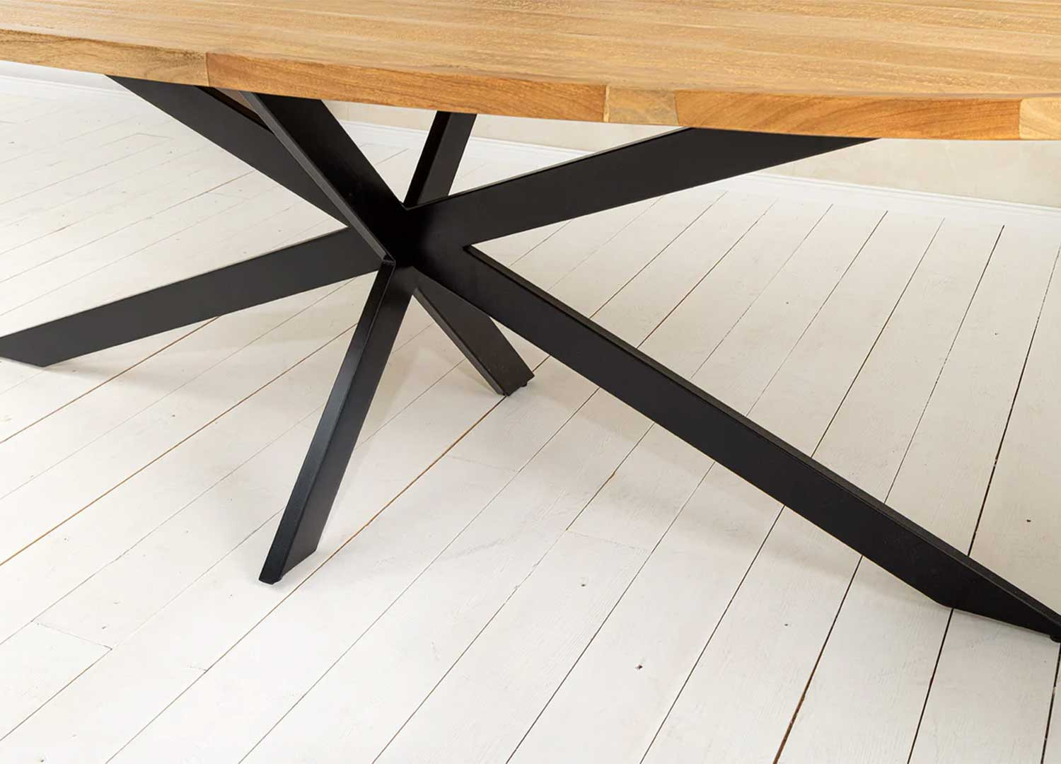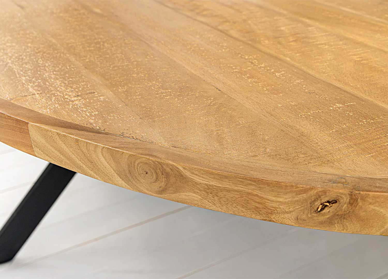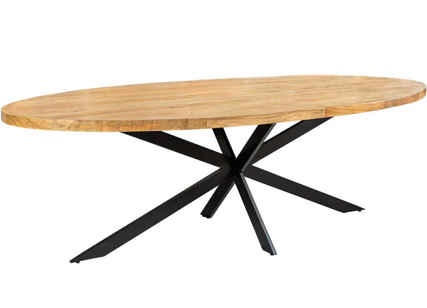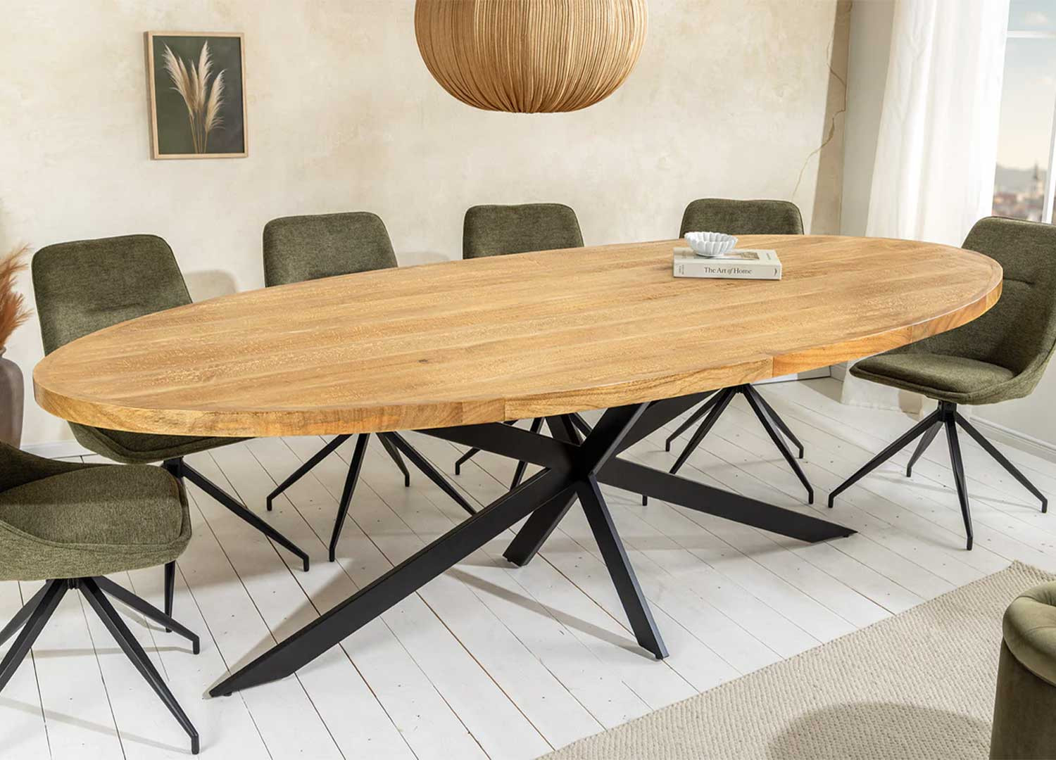 Conçue en bois de manguier massif à la teinte naturelle marron clair, la table à manger Tilio séduit par son grain authentique, ponctué de légères variations de teintes qui rendent chaque pièce unique. Son plateau ovale de 240 cm repose sur un piètement en métal noir araignée. Cette alliance du bois naturel et du métal incarne parfaitement le style industriel chic. Cette table de salle à manger est idéale pour accueillir confortablement 8 à 10 convives.