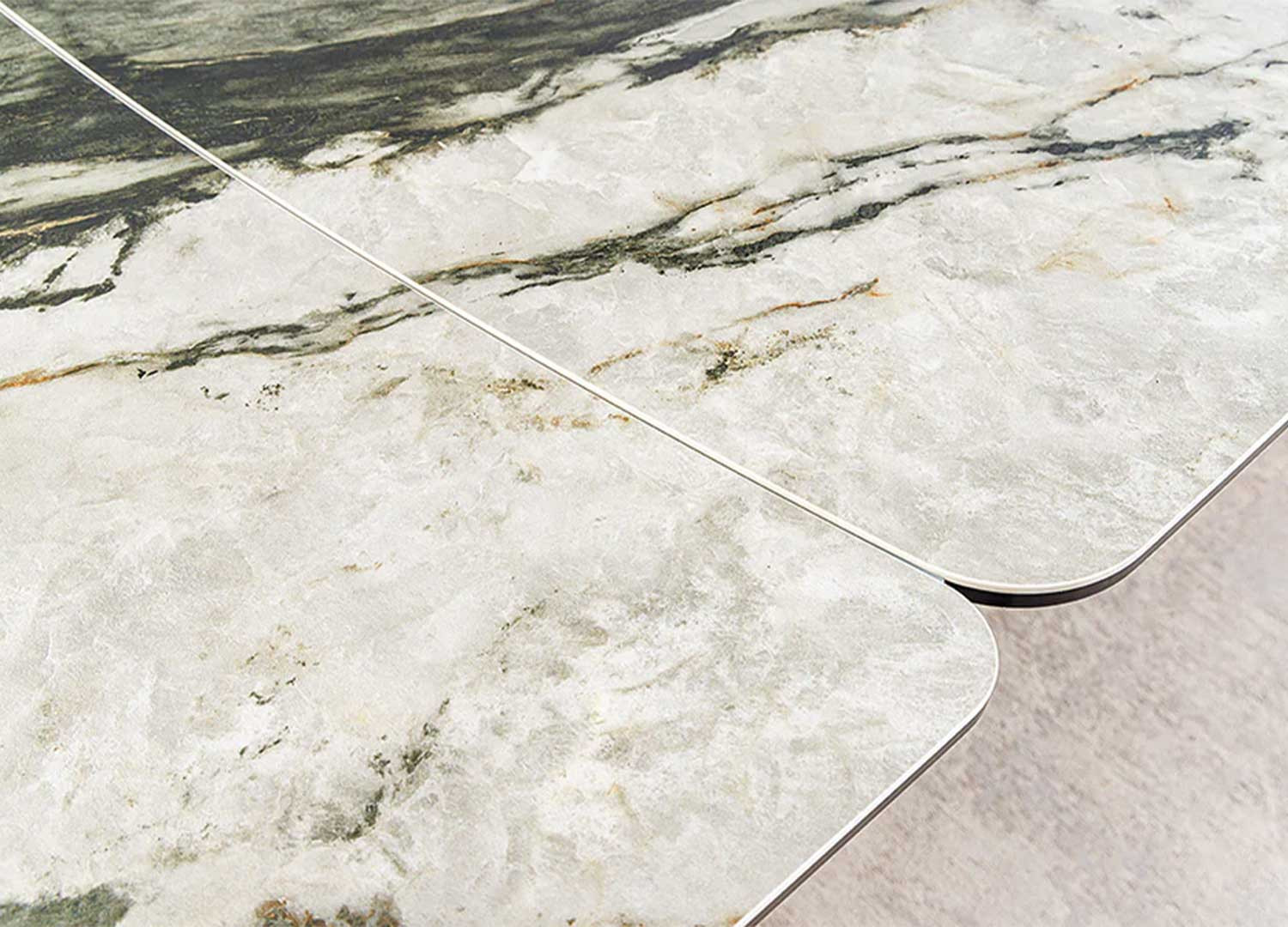 La table à manger Myra combine un plateau céramique effet marbre gris taupe de 12 mm d’épaisseur avec une structure en placage noyer et un socle en métal noir. Elle est extensible grâce à 2 allonges en extrémité lui permettant de passer de 180 à 260 cm, idéale pour adapter la taille selon vos besoins.