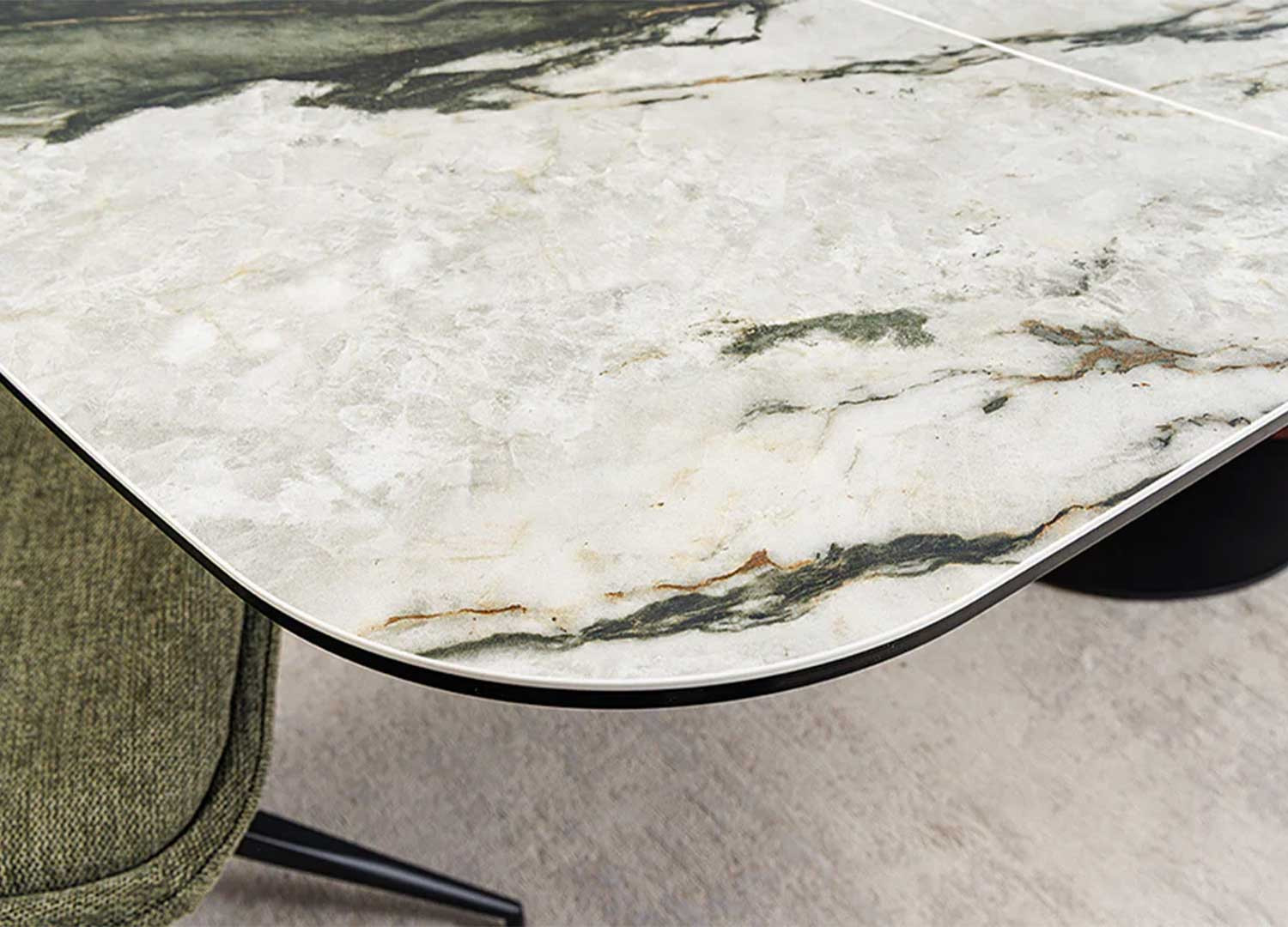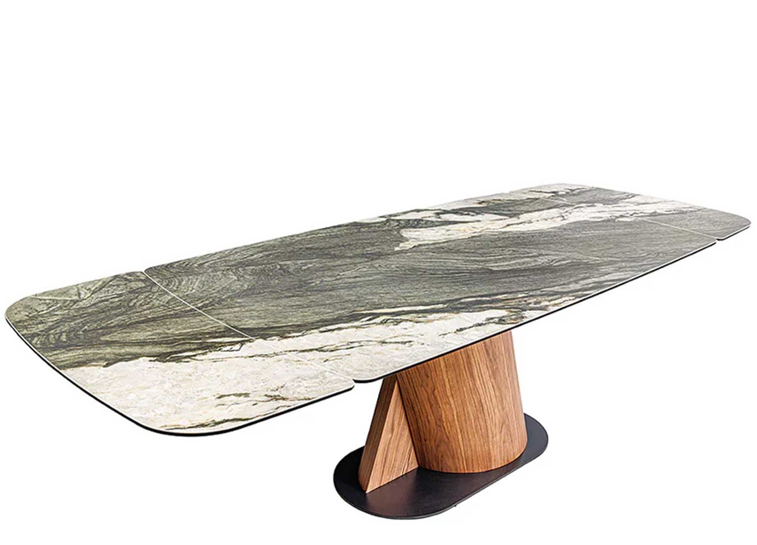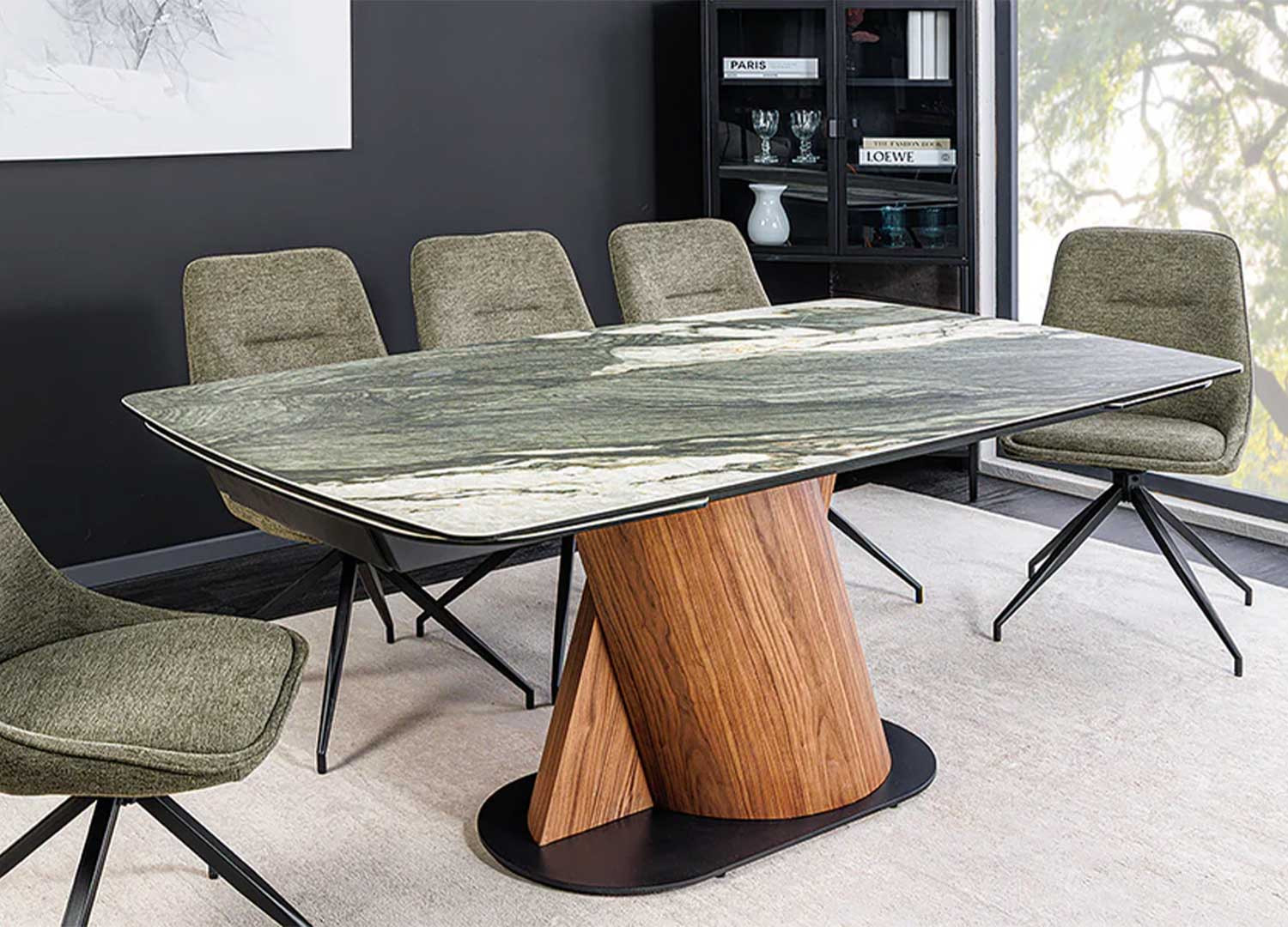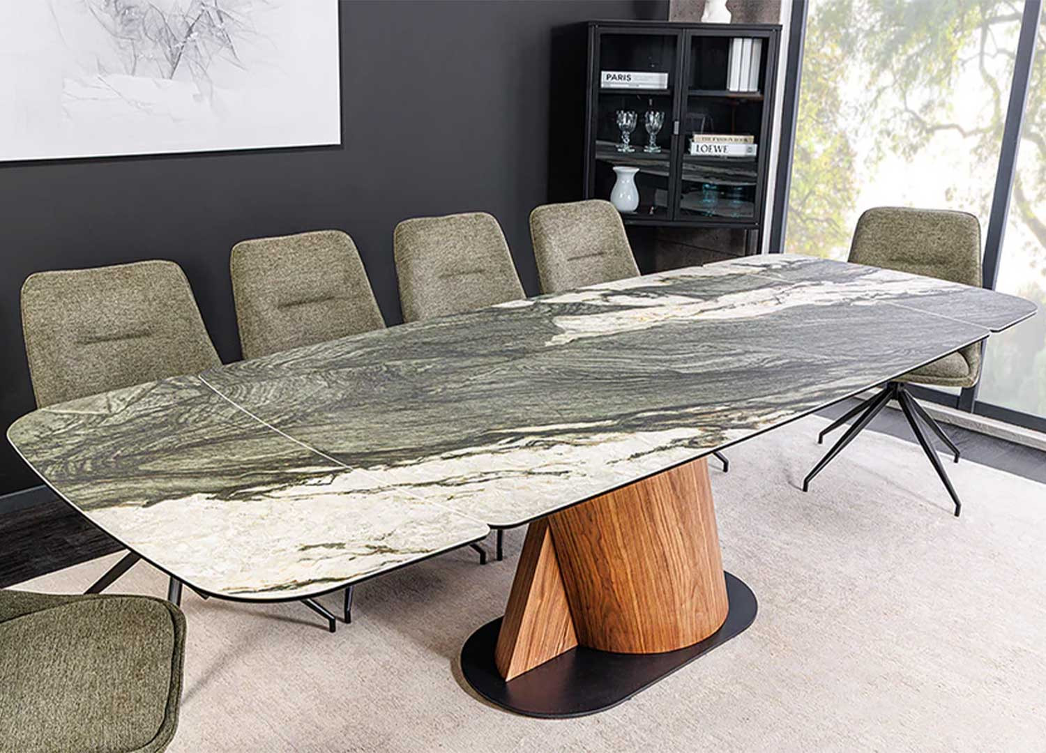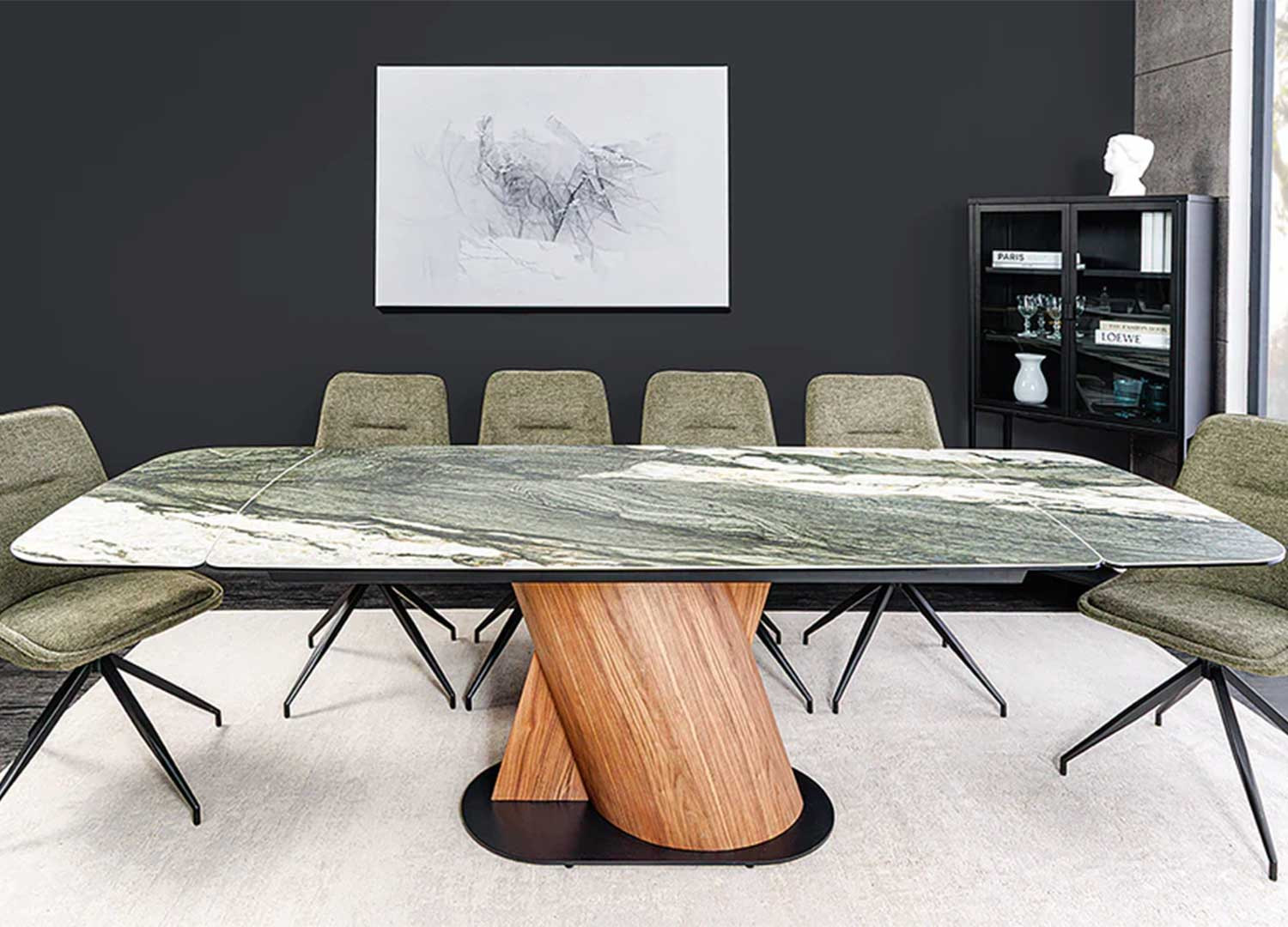 ✓ Cette table de salle à manger est une pièce d’exception où la céramique et le bois s’unissent pour former un ensemble élégant.