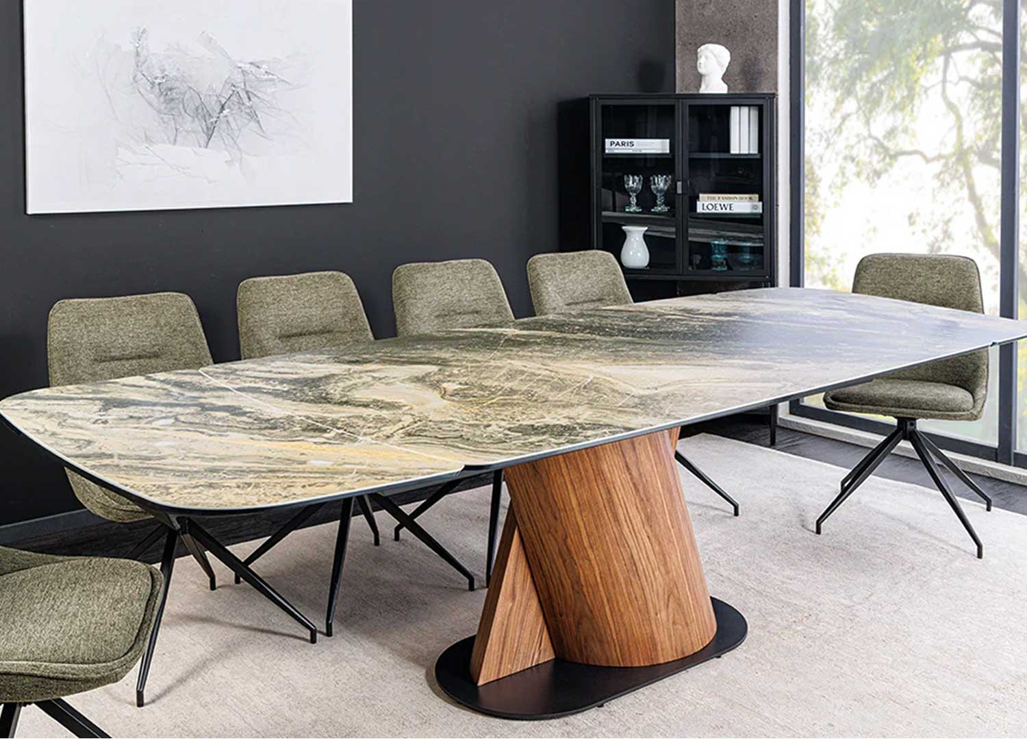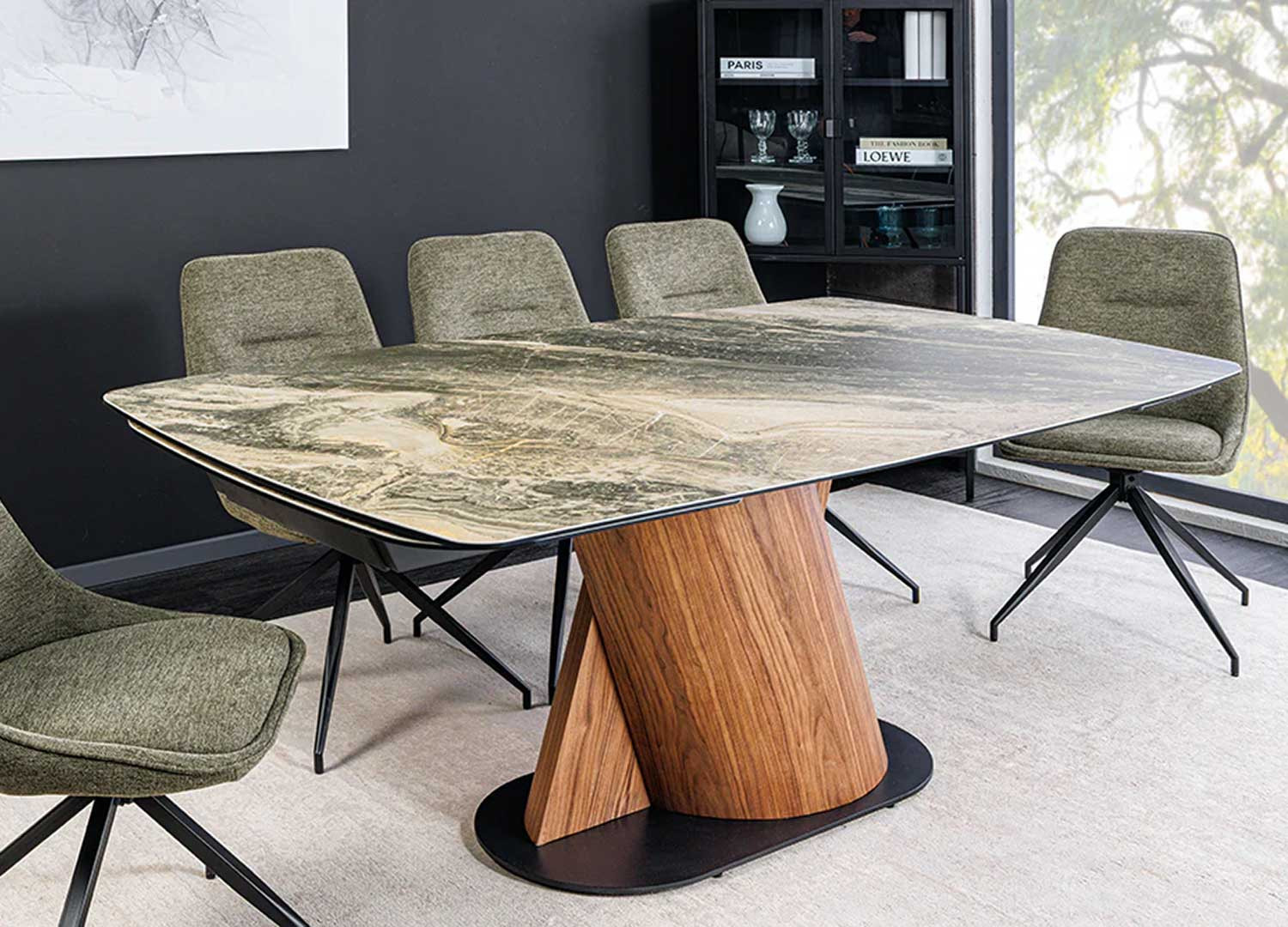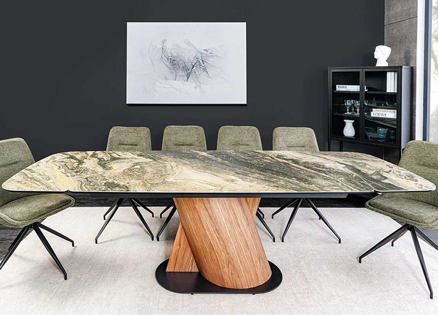 ✓ Cette table de salle à manger est une pièce d’exception où la céramique et le bois s’unissent pour former un ensemble élégant.