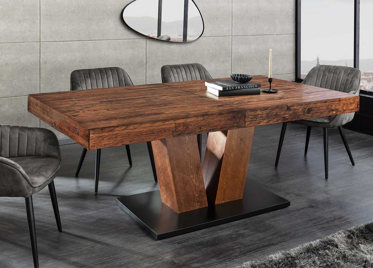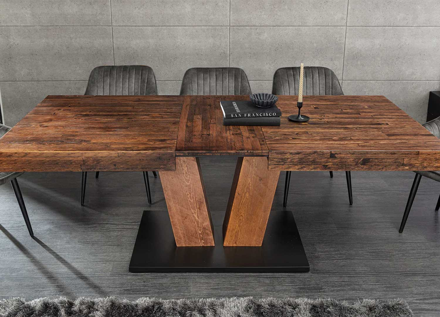 La table à manger Malaya est un modèle extensible au style rustique et industriel à la fois. Elle est fabriquée en bois de pin naturel et en MDF. Son plateau mesure 160 cm de long et peut être étendu jusqu’à 200 cm grâce à une rallonge. Le plateau repose sur un piètement en forme de V qui lui confère une allure moderne et originale.