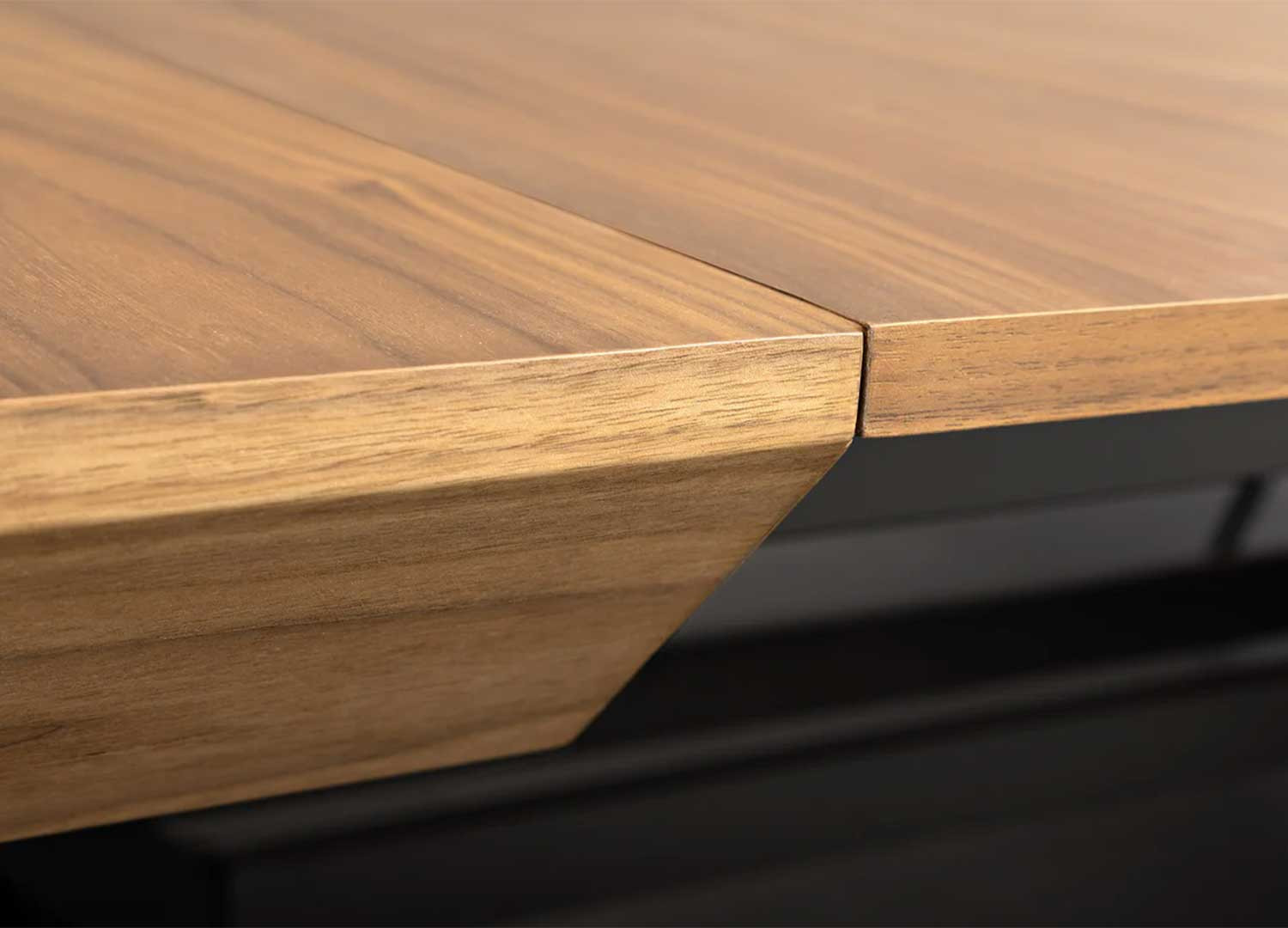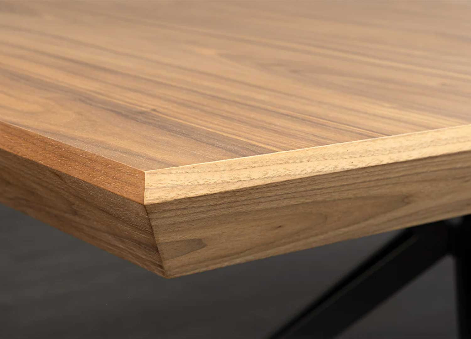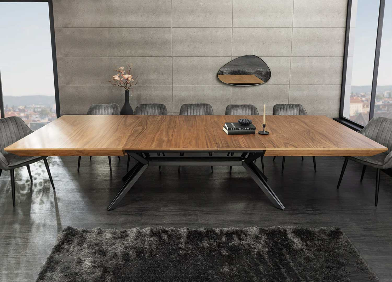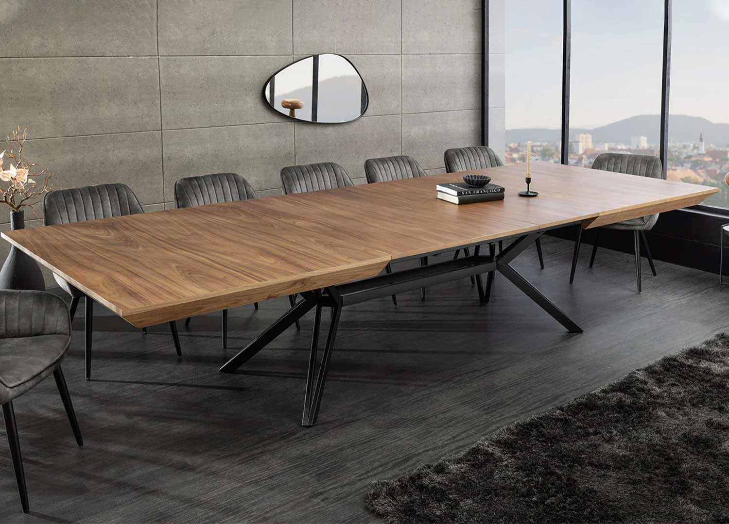 La table à manger Armando constitue un choix idéal pour ceux qui souhaitent une grande table extensible au design industriel. Elle est fabriquée en MDF recouvert d'un placage noyer et dispose d'un piétement en métal noir. Elle s’intègrera parfaitement dans une ambiance loft ou atelier et convient tout autant aux repas conviviaux en famille qu’aux grandes tablées entre amis.