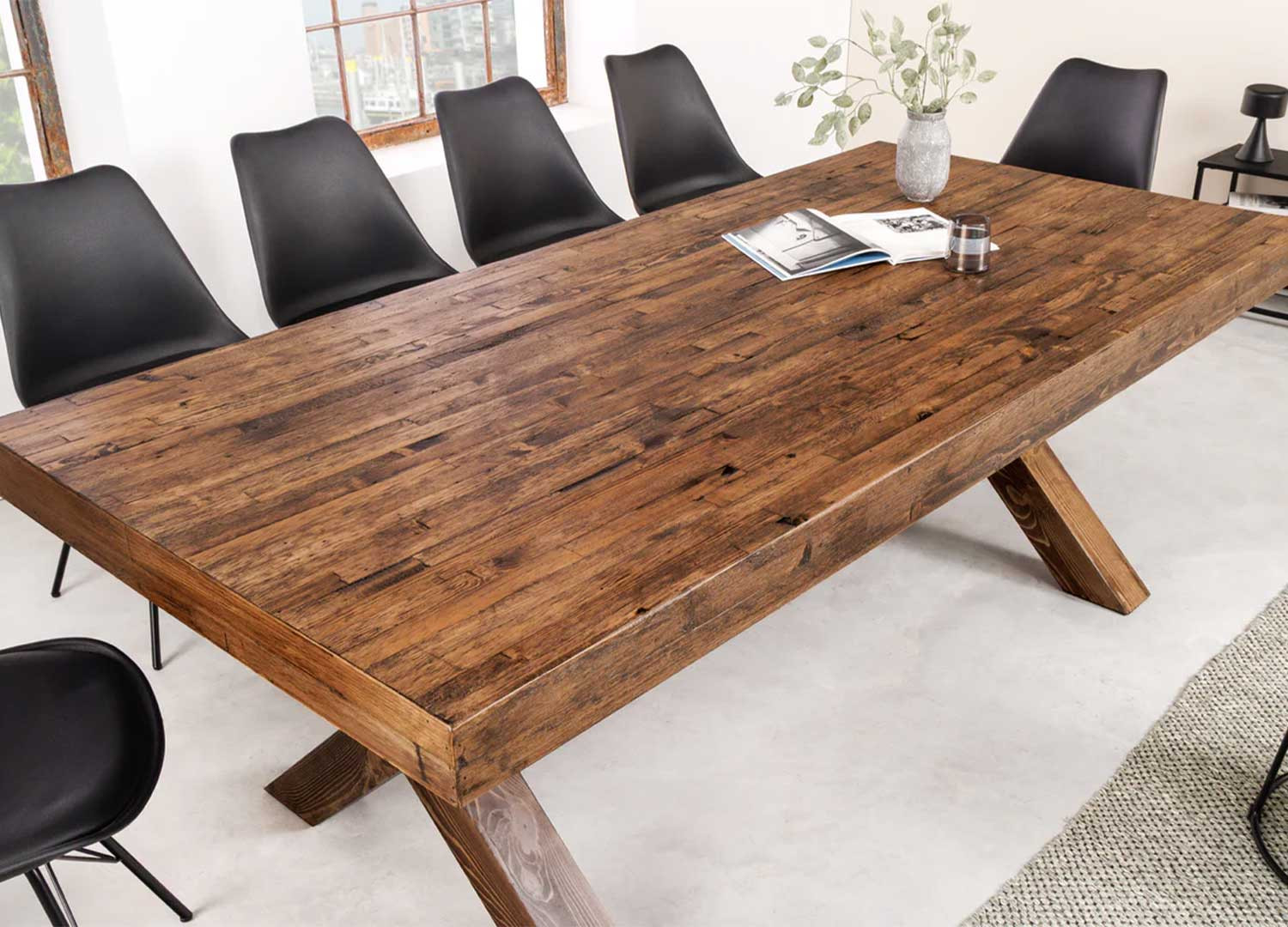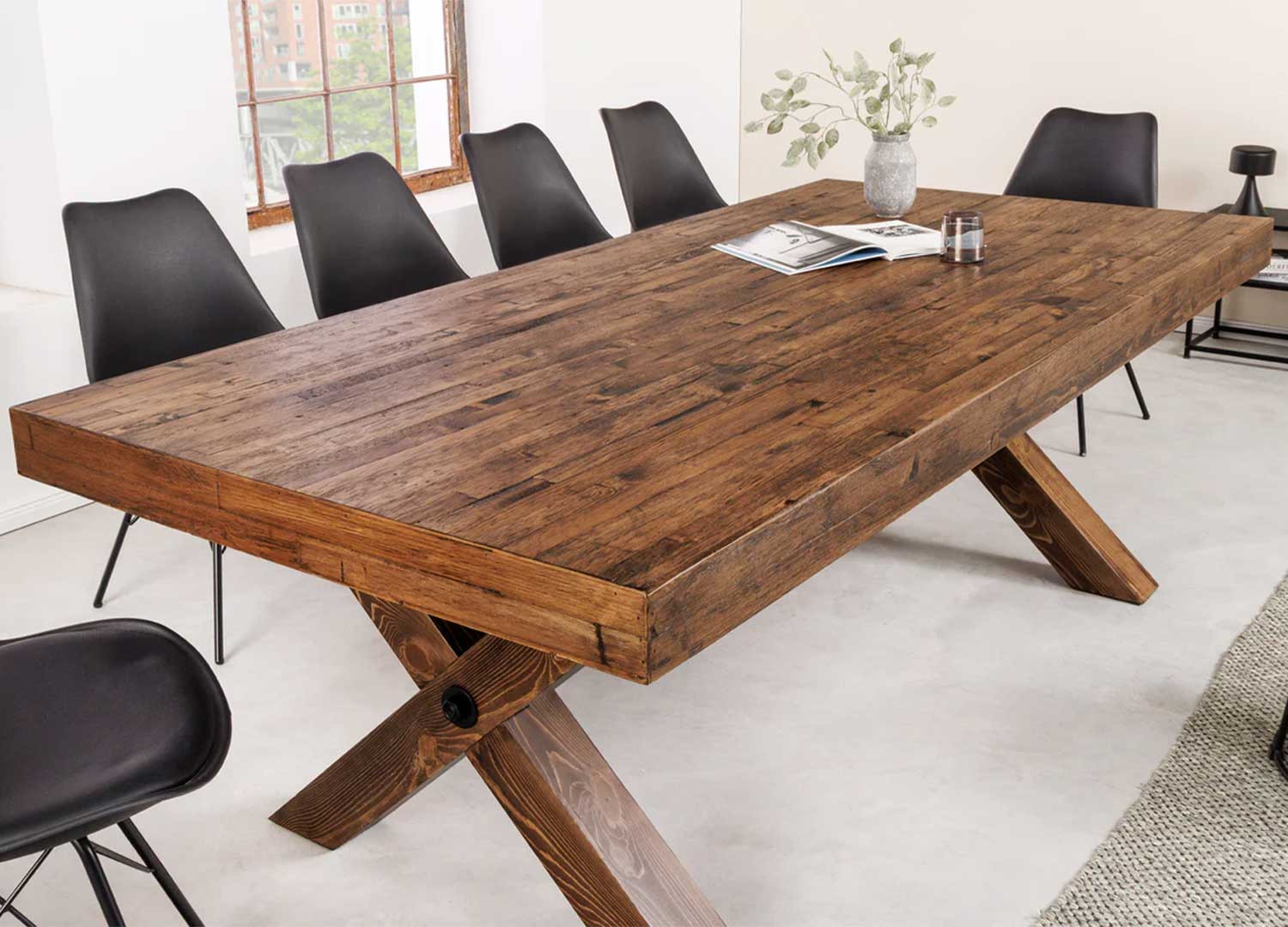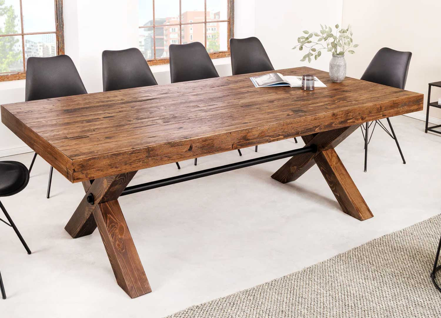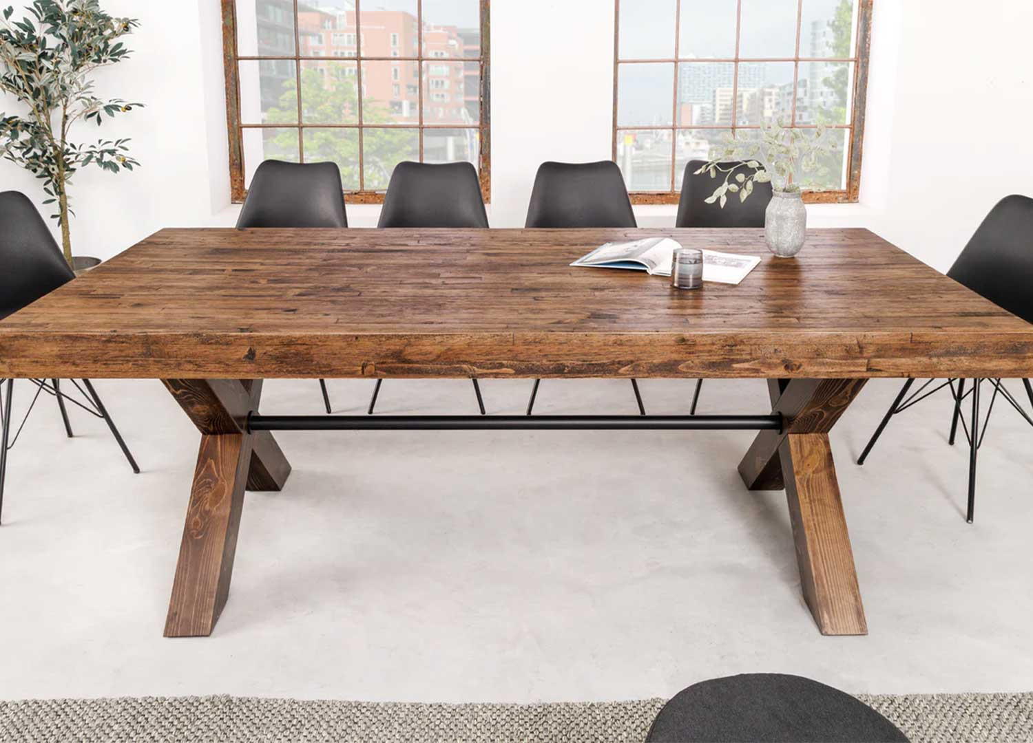 La table à manger Malaya est généreuse grâce son grand plateau de 210 cm qui permet d'accueillir confortablement 8 à 10 personnes. Son plateau est réalisé en placage de pin dans une teinte naturelle qui met en valeur les veinures et la texture du bois. Le piètement se présente sous forme de X et est relié par une barre métallique noir de renfort.