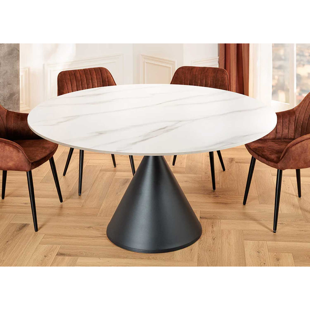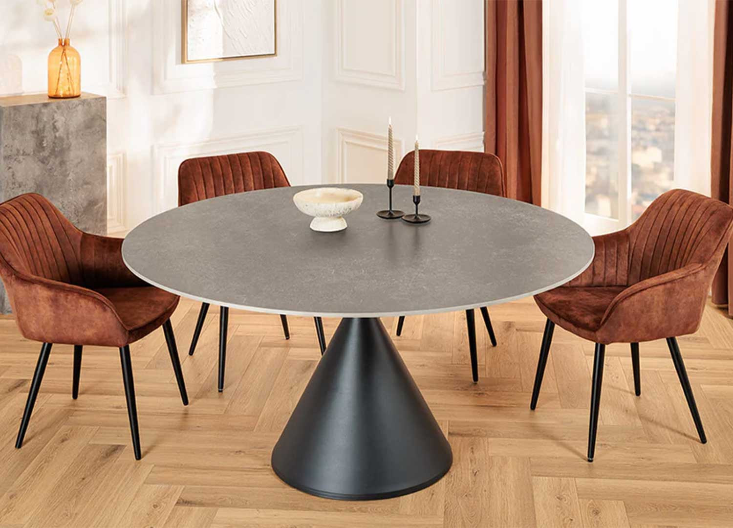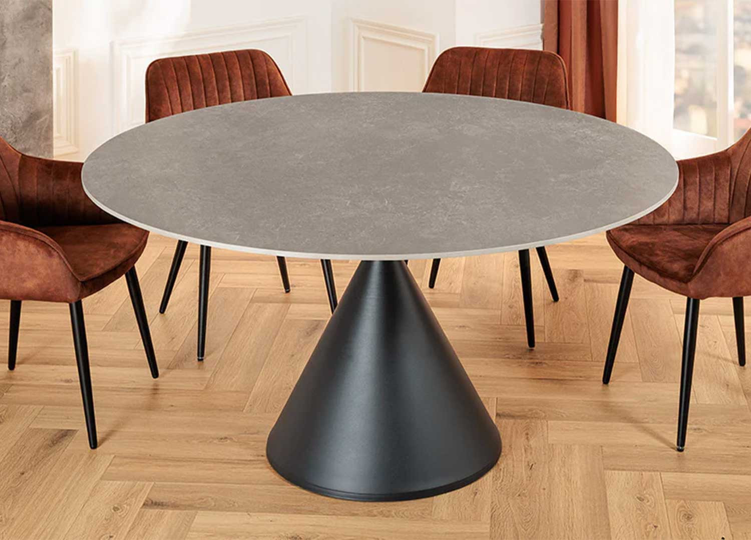 La table ronde de 135 cm Ariana est dotée d'un plateau en céramique aspect marbre gris et d'un pied central conique en métal noir. Design et moderne, cette table à manger ronde est parfaite pour réunir confortablement 4 à 6 convives.