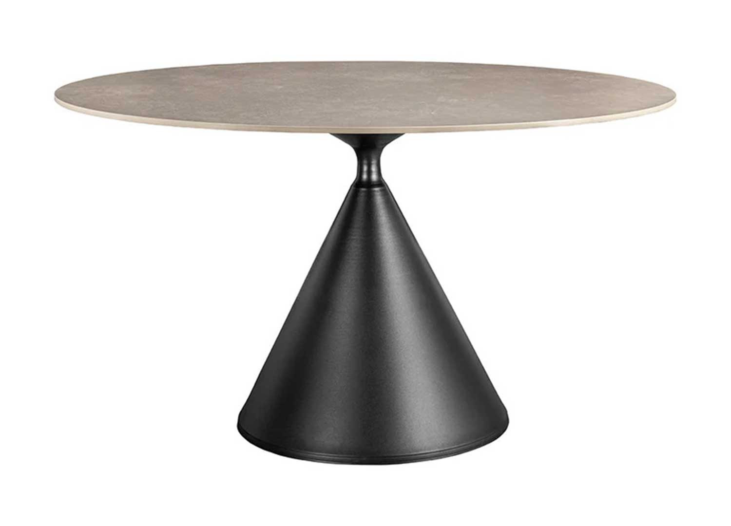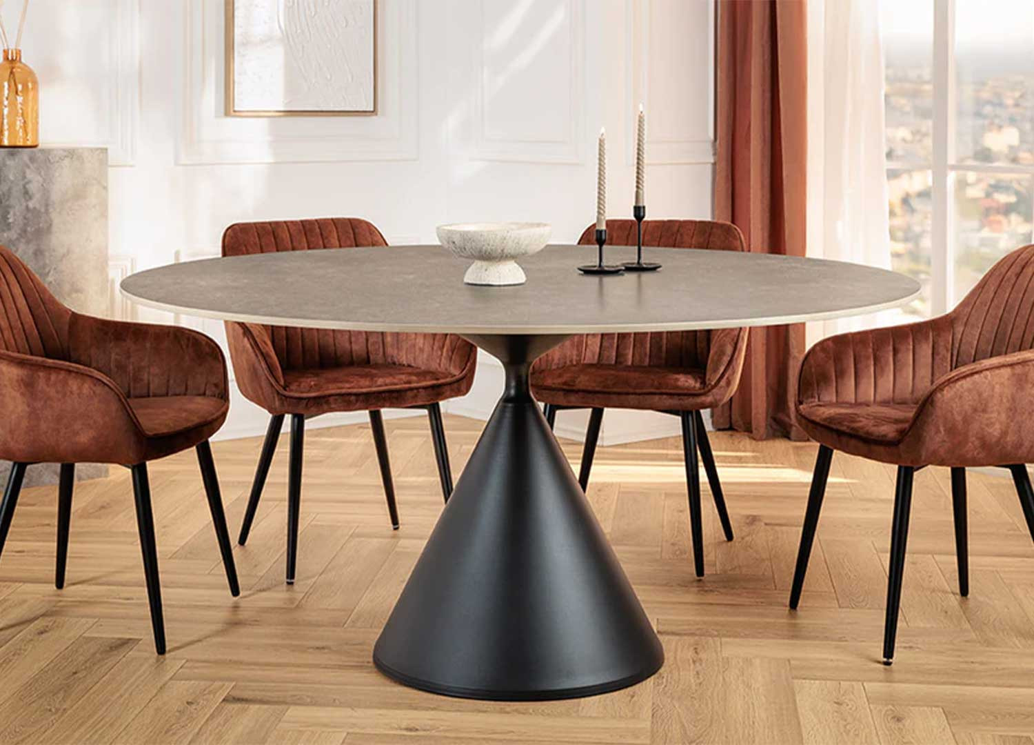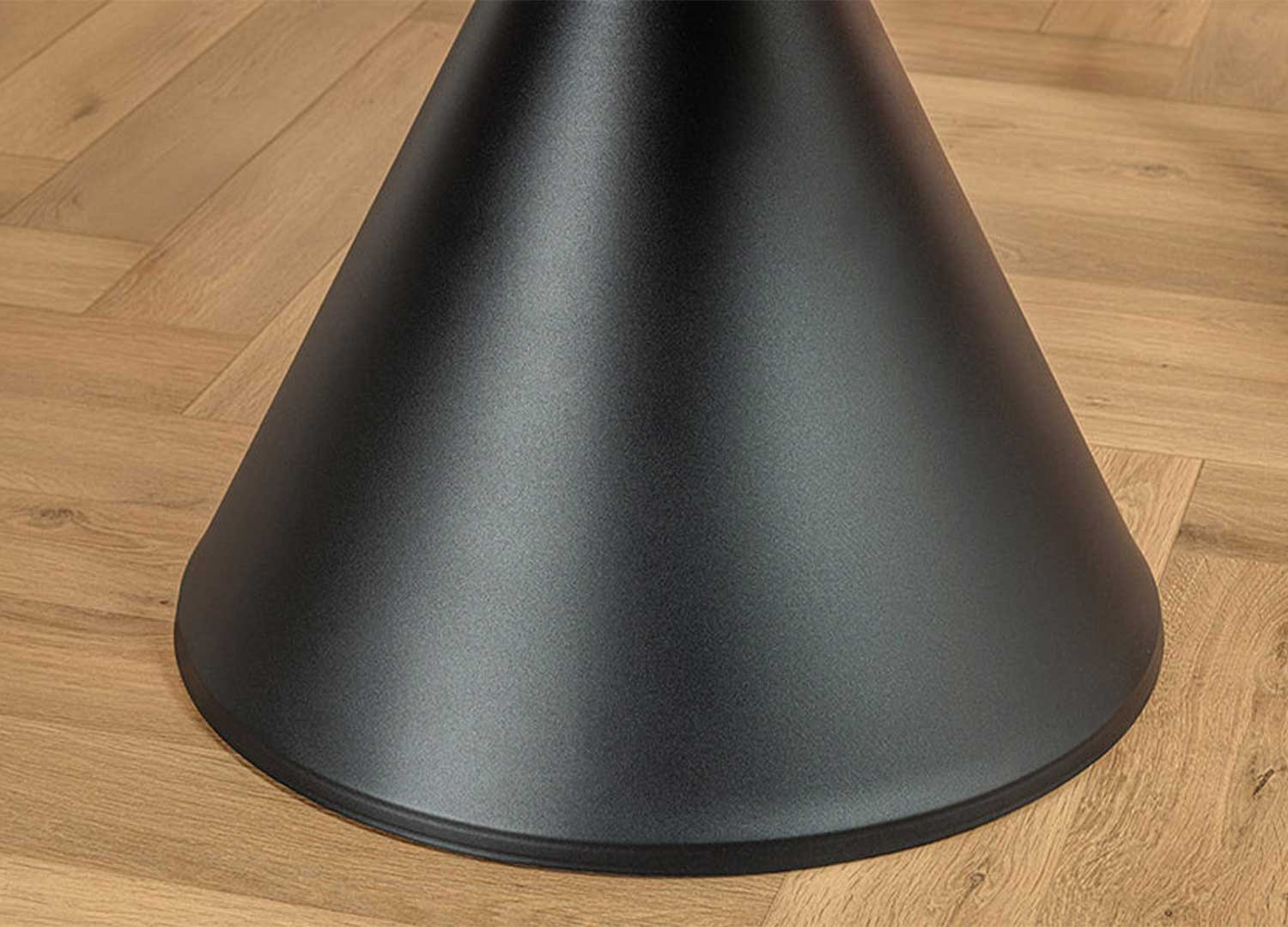 La table ronde de 135 cm Ariana est dotée d'un plateau en céramique aspect marbre gris et d'un pied central conique en métal noir. Design et moderne, cette table à manger ronde est parfaite pour réunir confortablement 4 à 6 convives.