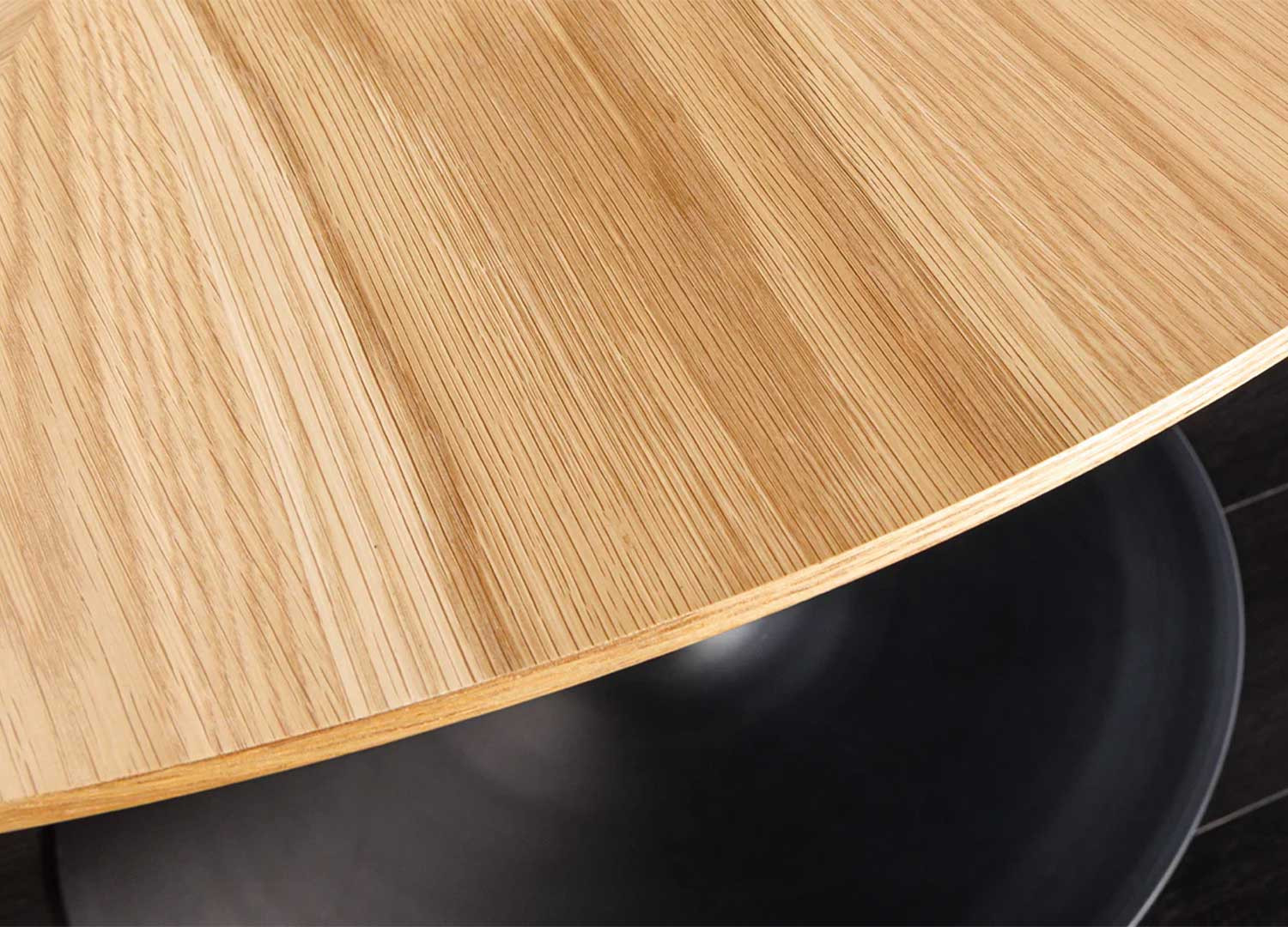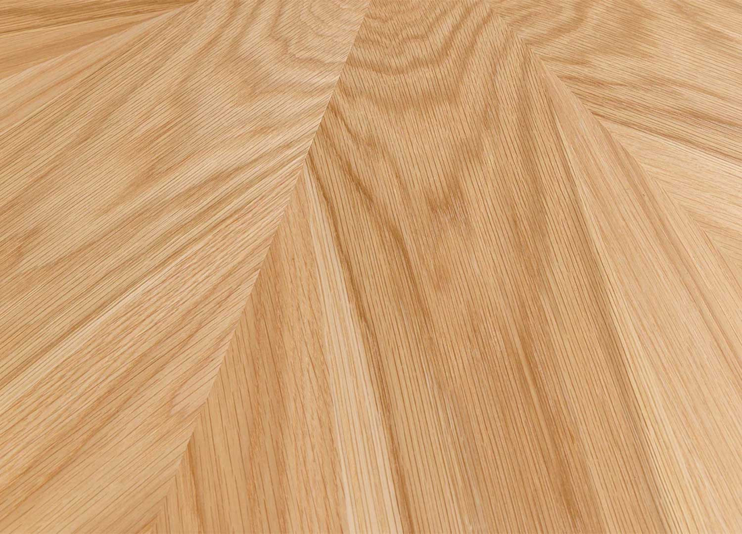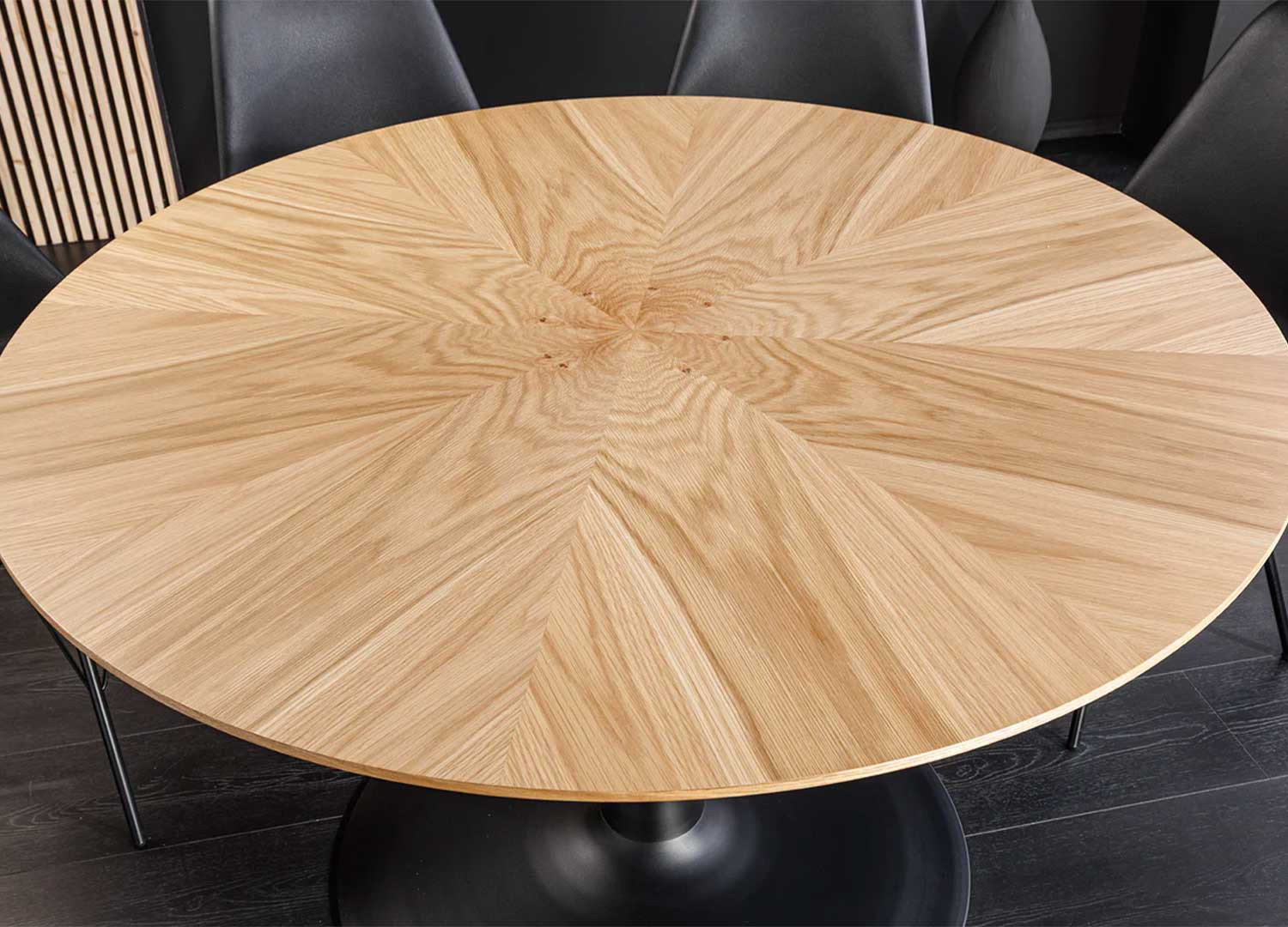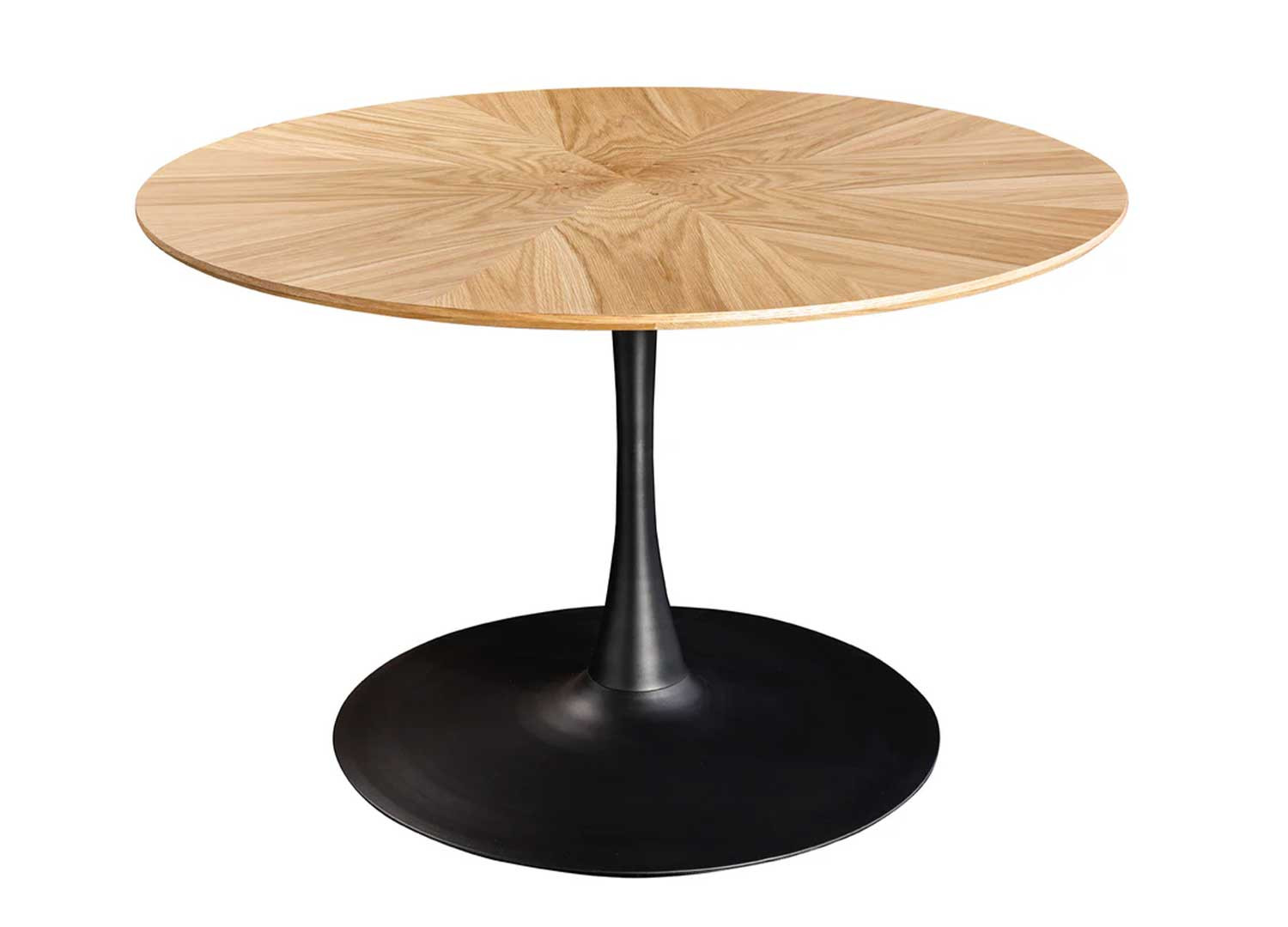La table ronde Anaya 120 cm impose sa présence dans la salle à manger. Son plateau en bois aspect chêne est recouvert d’un beau placage de chêne avec un motif étoile travaillé. Le pied central de forme tulipe est en métal noir et permet de librérer de l'espace autour de la table.