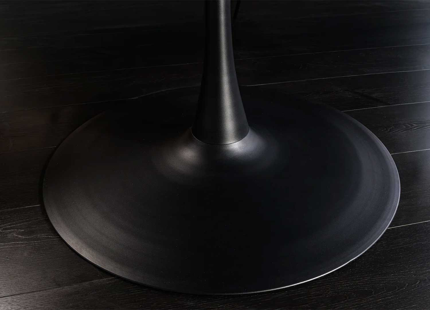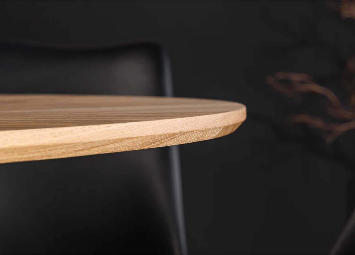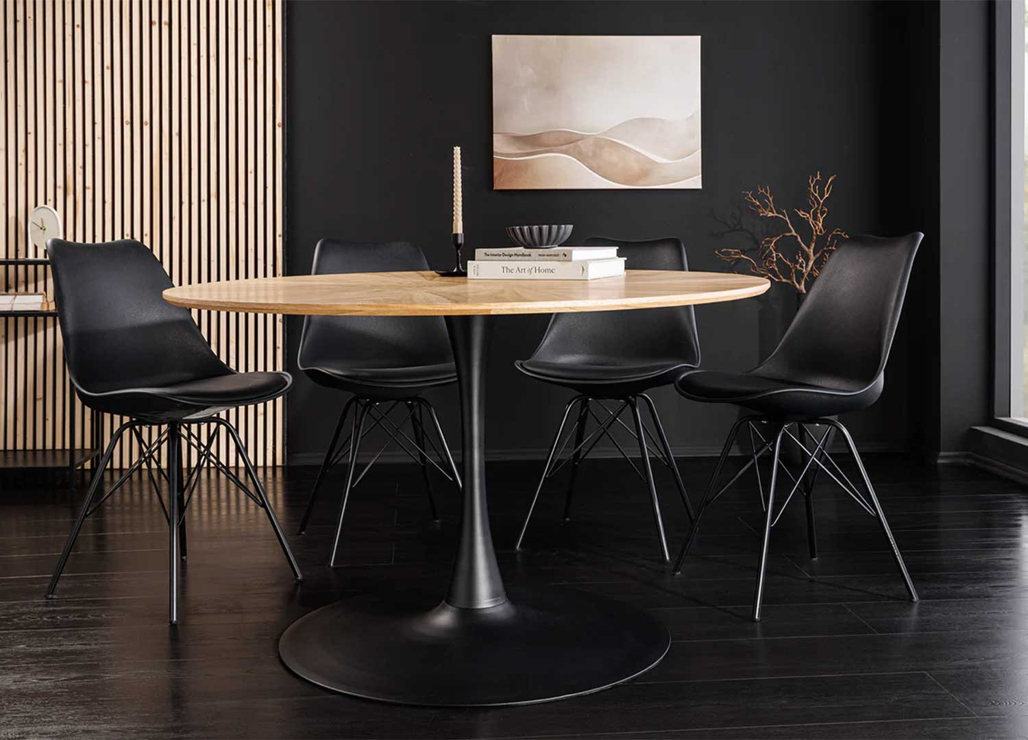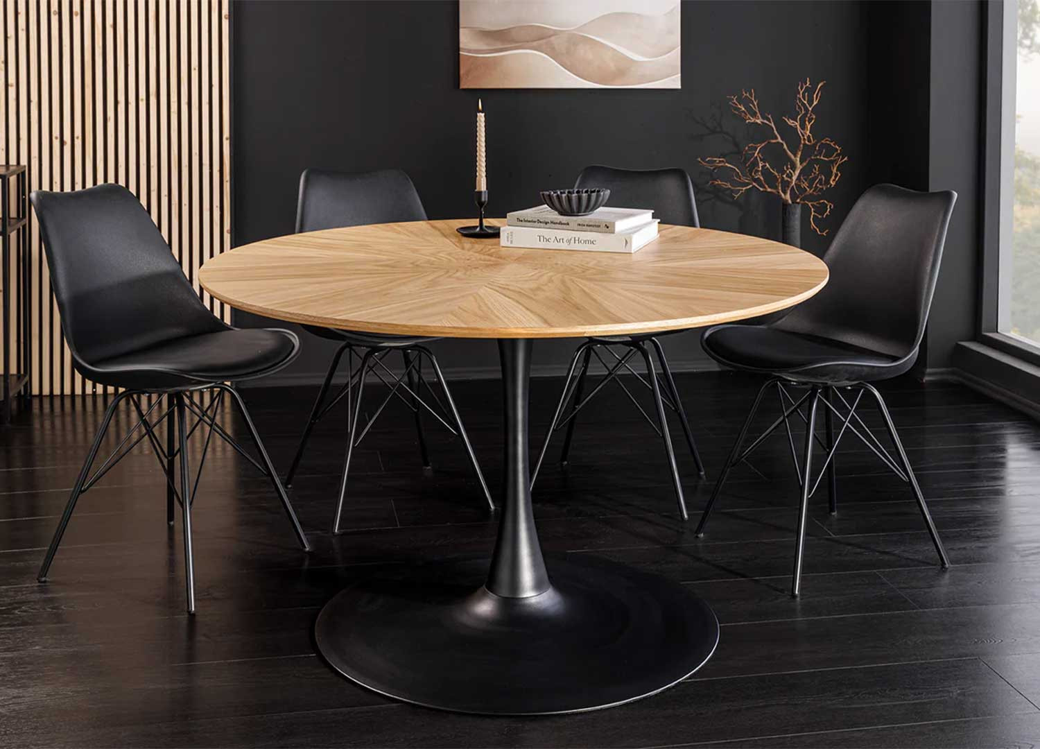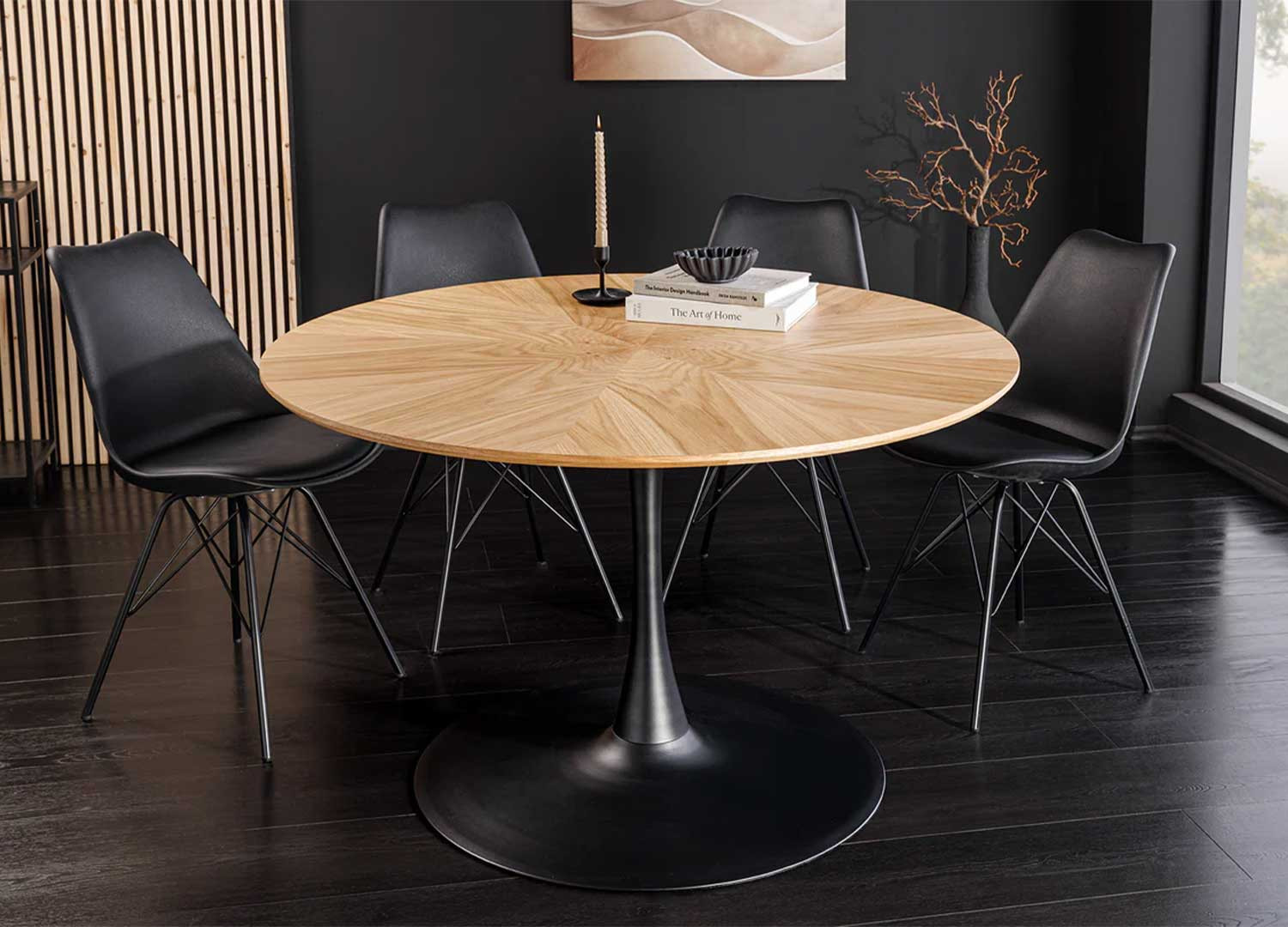 ✓ Avec la table à manger ronde Anaya, invitez le design industriel à votre table : un plateau effet chêne naturel avec des motifs, soutenu par un piètement tulipe noir qui impose style et caractère à votre salle à manger.