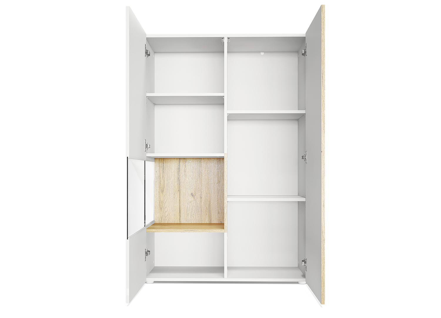 - 1 porte semi vitrée intégrant 1 tablette réglable en hauteur + 2 tablettes fixes soit 4 compartiments de rangement