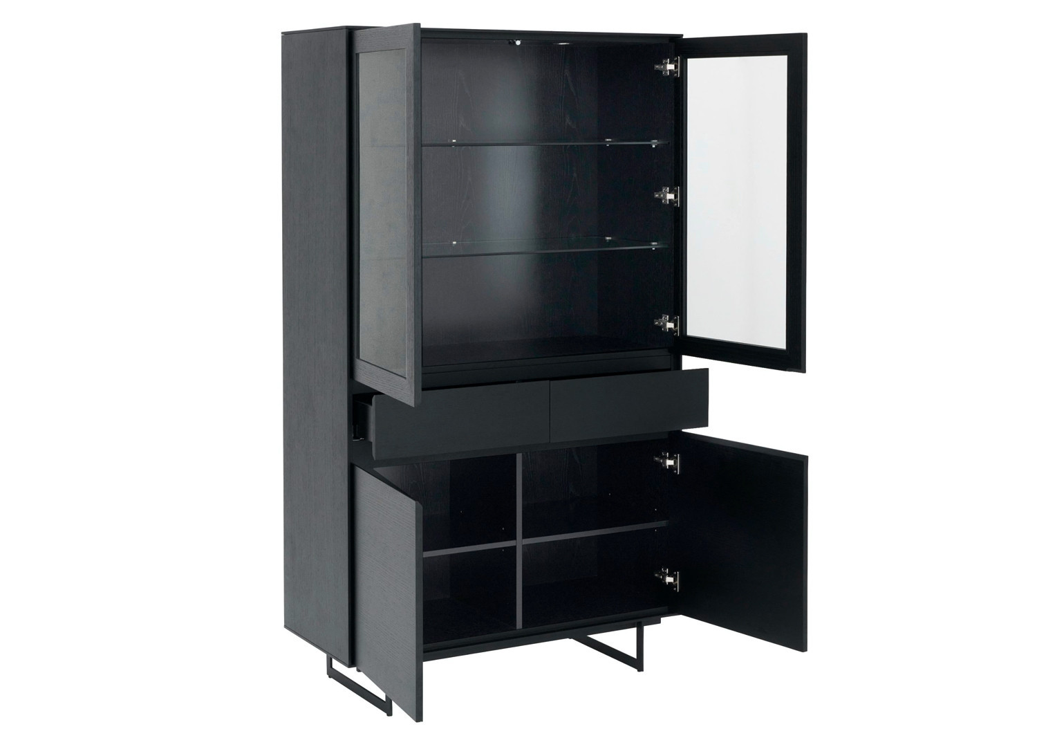 Détail de la grande vitrine noire - 2 portes semi vitrées intégrant 2 étagères en verre - 2 tiroirs - 2 portes intégrant 2 étagères en bois - pied en métal noir d'une hauteur de 16 cm Les + produit ✔ portes et tiroir amortis ✔ éclairage led inclus ✔ meuble pré-assemblé |