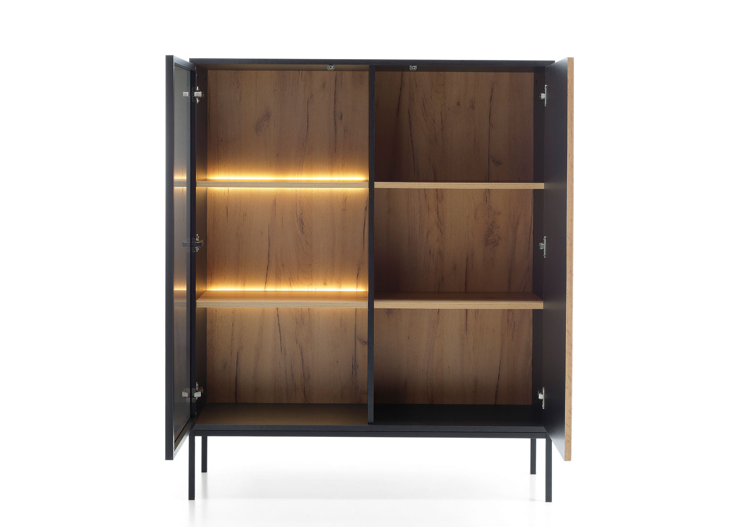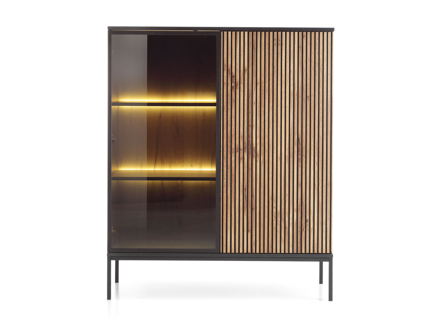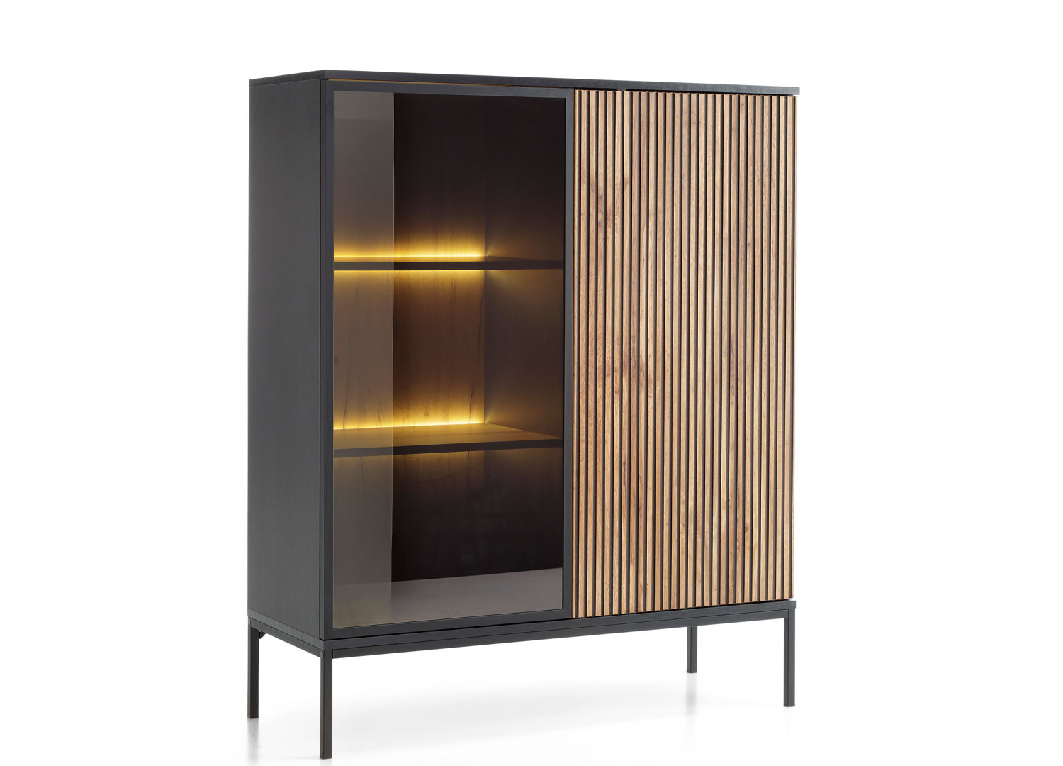 La vitrine Sento de 2 portes apparaît comme une pièce élégante de rangement et d’exposition pour les accessoires de salle à manger. Les façades combinent verre trempé partiel et rainures décoratives. L'ensemble repose sur un piétement métallique noir. Sans poignées, cette vitrine adopte un design moderne grâce au système push to open et intègre un éclairage LED intégré pour valoriser vos objets exposés.