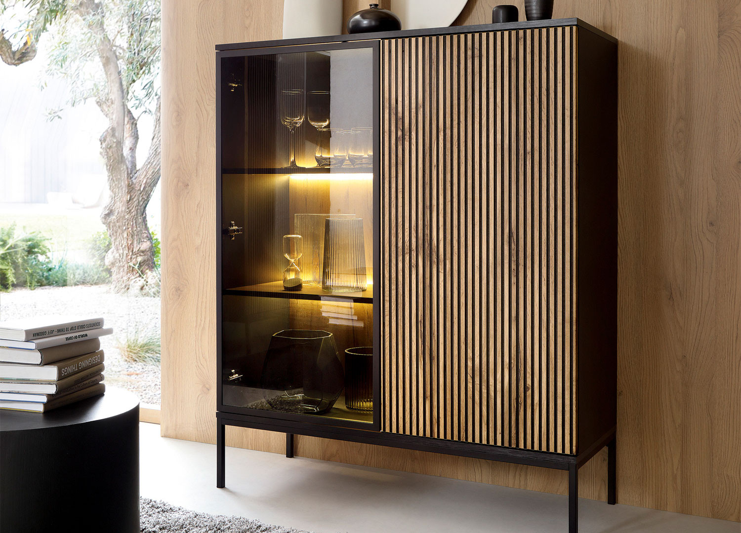 ✓ Avec ses 126 cm de hauteur, la vitrine Sento offre de beaux volumes de rangement pour la vaisselle et les accessoires de salle à manger.